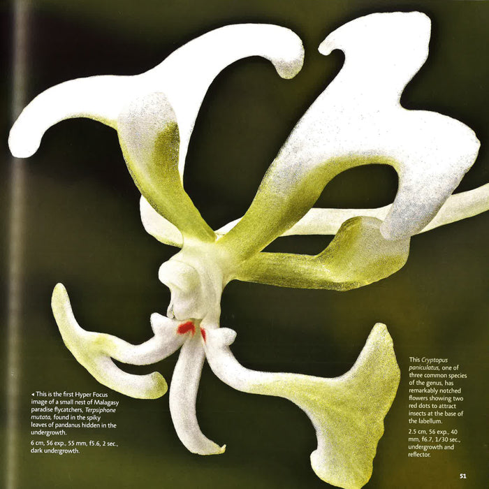 Philippe Martin revolutionized digital nature photography by "stacking" images. To take one photograph, he will shoot a subject hundreds of times, stack the images into a composite, and then clean up the composite image pixel by pixel. The result is a "quasi-3D" photograph of nature with such sharpness and brilliance that surely it will leap from the page. What's more, Martin takes the photographs in his subjects' natural setting, including inhospitable jungles.
