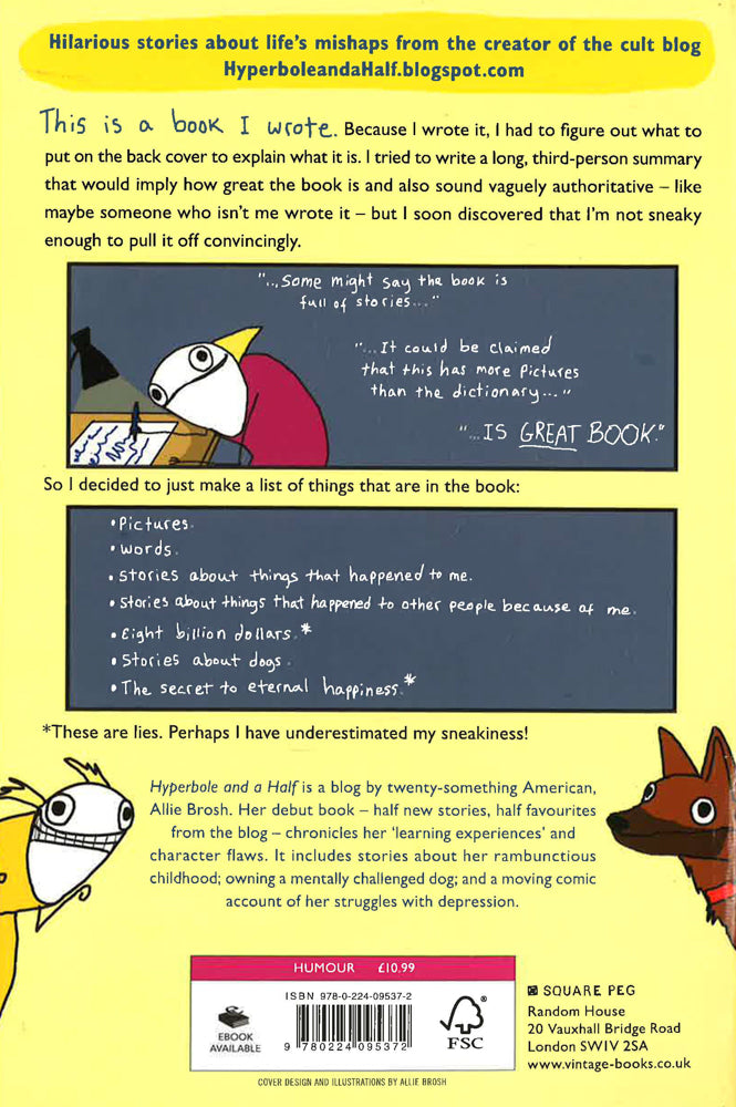 Hilarious stories about life's mishaps from the creator of the immensely popular blog 'Hyperbole and a Half'. Fully illustrated with over 50% new material. Hyperbole and A Half is a blog and webcomic written by a 20-something American girl called Allie Brosh.Hilarious stories about life's mishaps from the creator of the immensely popular blog 'Hyperbole and a Half'. Fully illustrated with over 50% new material. Hyperbole and A Half is a blog and webcomic written by a 20-something American girl called Allie Brosh. She tells fantastically funny, wise stories about the mishaps of her everyday life, with titles like 'Why Dogs Don't Understand Basic Concepts Like Moving' and 'The God of Cake'.. Brosh's website receives millions of visitors a month and hundreds of thousands per day. Now her full-colour debut book chronicles the many 'learning experiences' Brosh has endured as a result of her own character flaws. It includes stories about her rambunctious childhood; the highs and mostly lows of owning a mentally challenged dog; and a moving and darkly comic account of her struggles with depression. 'Quirky and captivating' Observer'It's impossible not to warm to cartoonist and blogger Allie. If she doesn't get to you with her funny childhood anecdotes (eating an entire birthday cake) then her honest reflections on depression will' Grazia