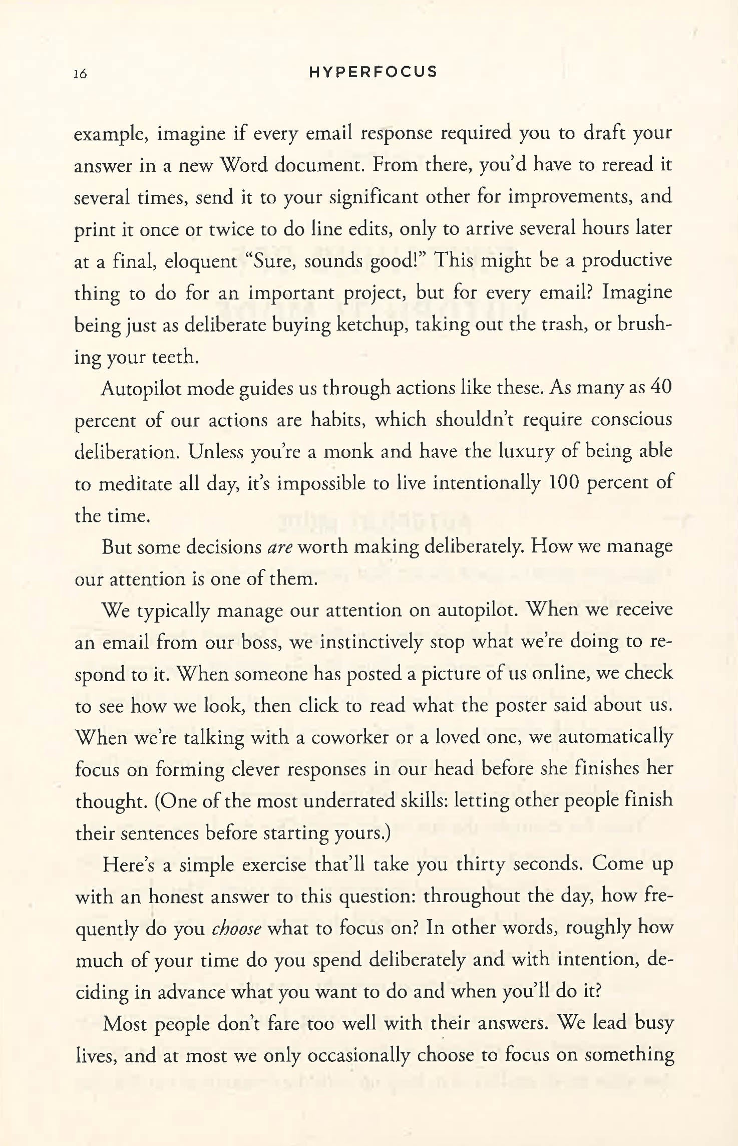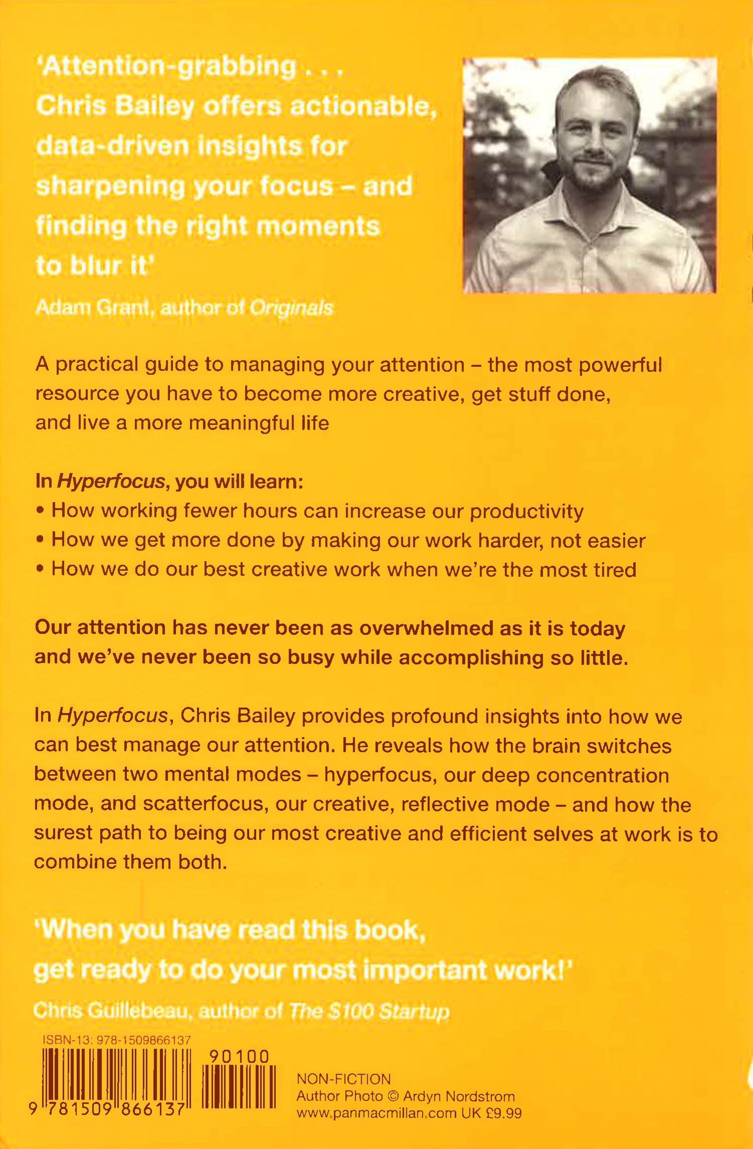 The most productive man you'd ever hope to meet' - TEDHyperfocus by Chris Bailey is a practical guide to managing your attention - the most powerful resource you have to become more creative, get stuff done, and live a more meaningful life.In Hyperfocus, you will learn:- How working fewer hours can increase our productivity- How we get more done by making our work harder, not easier- How we do our best creative work when we're the most tiredOur attention has never been as overwhelmed as it is today and we've never been so busy while accomplishing so little.In Hyperfocus, Chris Bailey provides profound insights into how we can best manage our attention. He reveals how the brain switches between two mental modes - hyperfocus, our deep concentration mode, and scatterfocus, our creative, reflective mode - and how the surest path to being our most creative and efficient selves at work is to combine them both.'The best productivity plans call for strategy, not just hacks or tactics - and Hyperfocus gives you strategy in spades. When you read this book, get ready to do your most important work!' - Chris Guillebeau, author of Side Hustle.