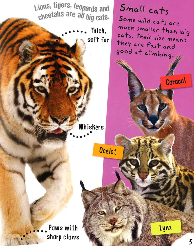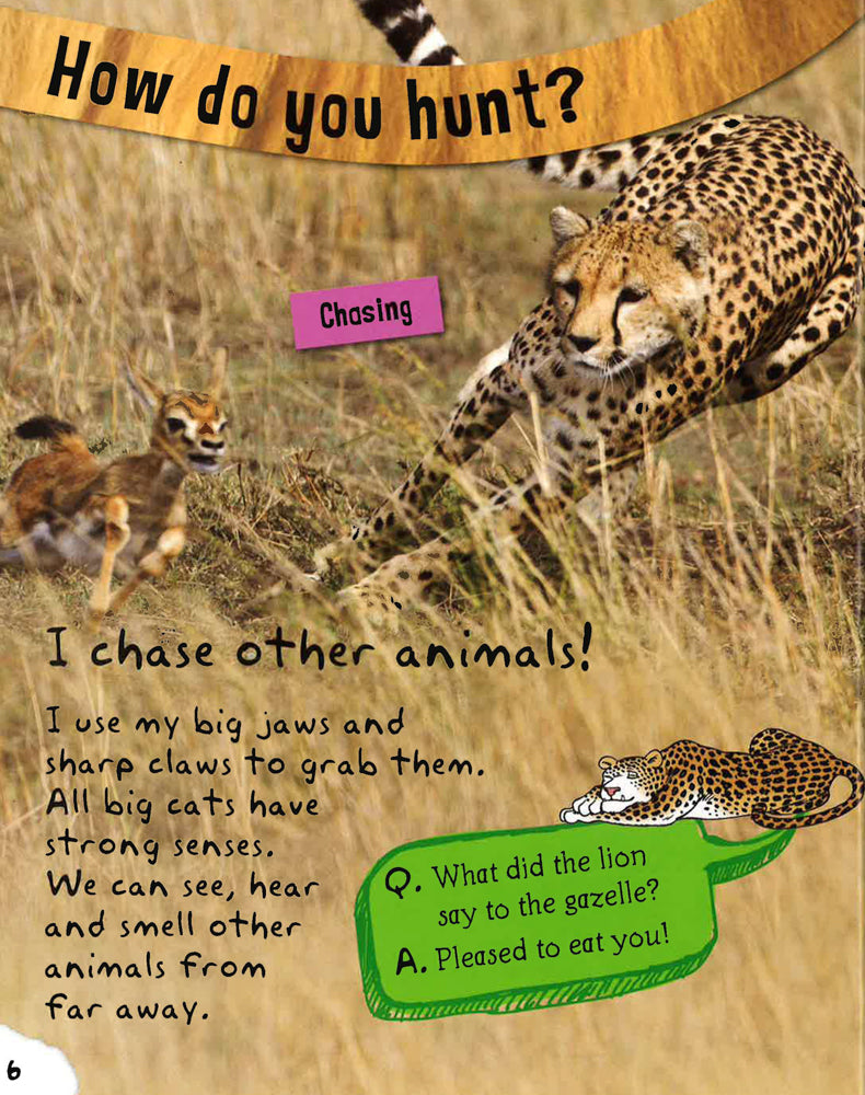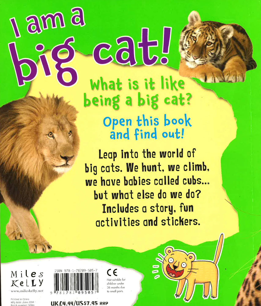 I am a big cat helps young readers aged 4+ find out what it is like to be a big cat! Stunning photographs, playful and informative text, jokes, cartoons and masses of things to make and do provide a creative way to learn and help develop reading skills. The fun story adds an interactive element the bright and colourful stickers can be placed on the pages. Children will love learning why lions roar, where leopards hide their food and how tigers stay cool in the jungle.