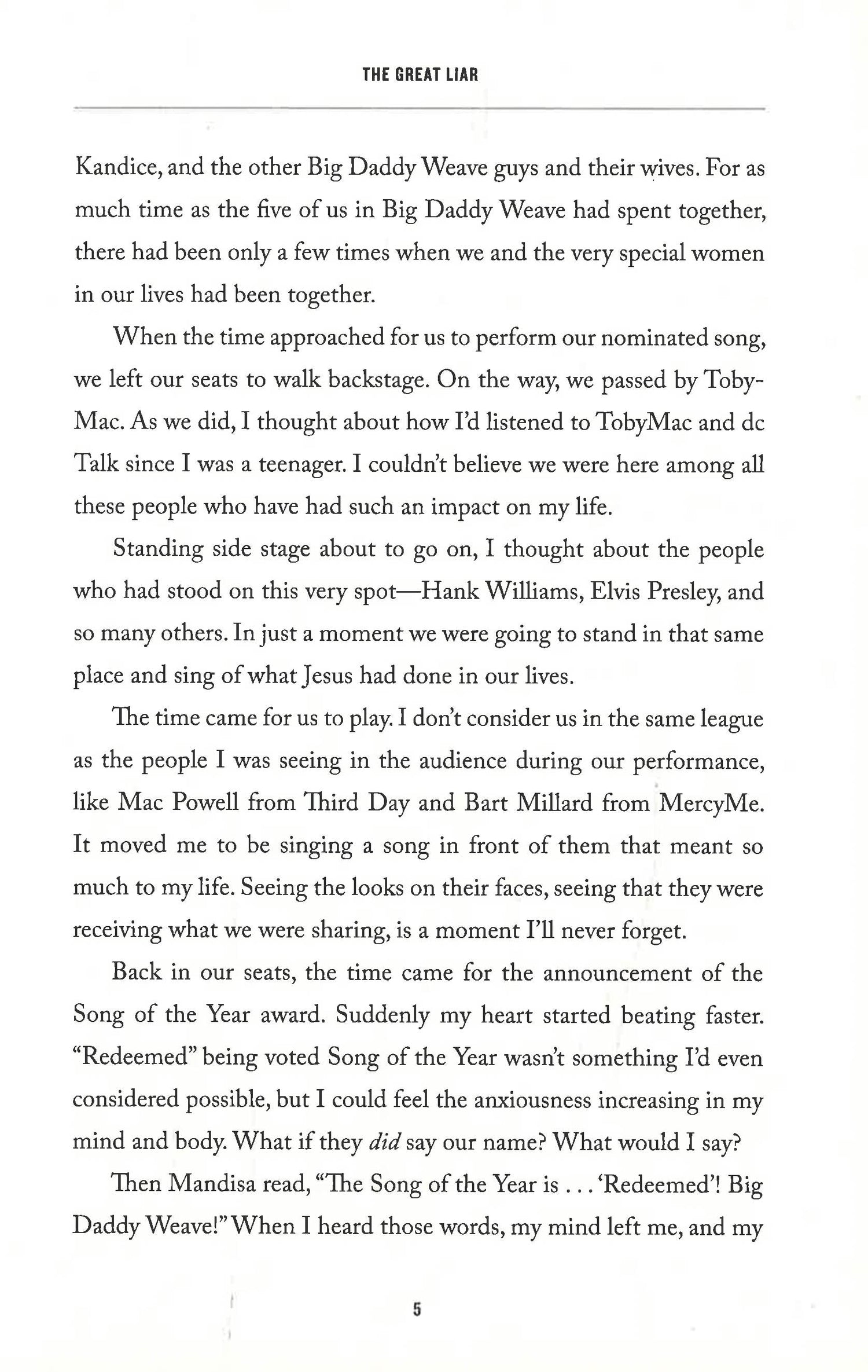I Am Redeemed is an open book of Mike Weaver's life, bringing into the light everything from his battle with self-hatred to the near death of his brother and bandmate, who ultimately had both feet amputated to save his life. Mike shares the lessons learned in the loss of his father and dealing with the spirit of suicide within his band, Big Daddy Weave.
