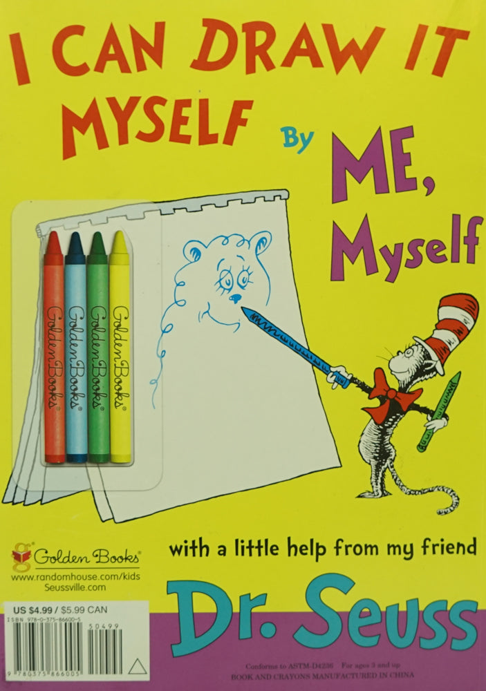 Budding artists and Seuss fans will be delighted to get their hands on this newly reissued backlist classic - now with four primary color crayons blister-packed to the front cover! The 18 full-color drawings in I Can Draw It Myself by Me, Myself are unfinished. Some are missing small things, like feet or fingers or noses or toes. Some are missing big things, like the whole front of a Hamika-Snamik-Bamika-Bunt. It's up to the reader to add what is missing. So whether kids are beginner or advanced colorers, there's something here for all skill levels. Perfect for rainy days or traveling, this is one book kids are supposed to draw all over!