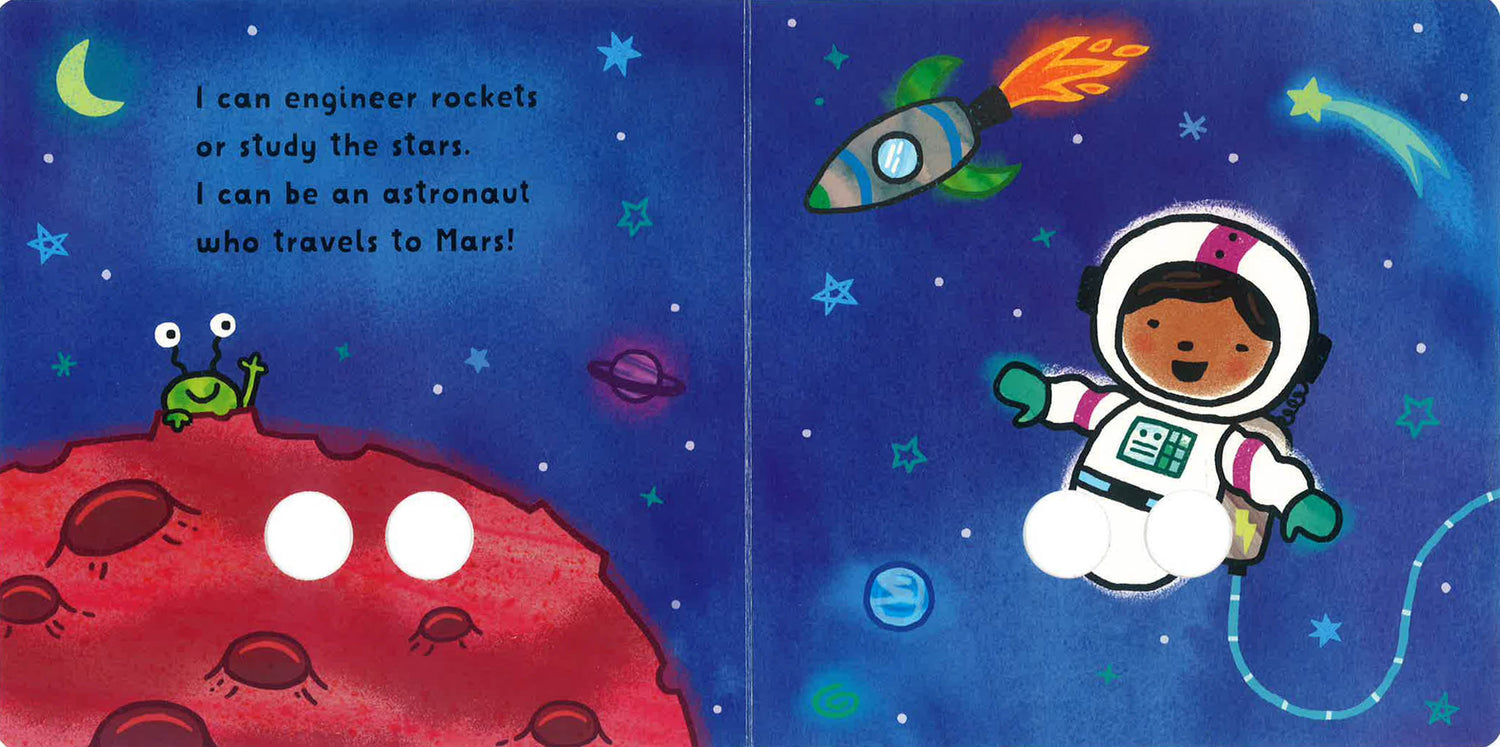 I Can Dream readers help characters pursue their aspirations from driving a race car to traveling to Mars - just by wiggling their fingers! Then, with two sets of hands, readers help the characters come together as they all follow their dreams in the gatefold finale. With interactive holes on every page, a satisfying touch-and-feel cover, and an impressive gatefold, these interactive board books are the perfect way to play and read together.
