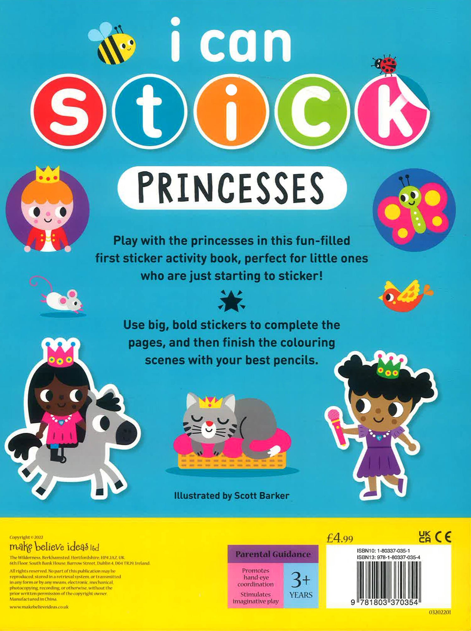 This princess-themed sticker book is perfect for little ones who are just starting to sticker! It uses simple, shaped stickers and bright, bold illustrations to reinforce children's shape awareness and hand-eye coordination. The colourful pages and clear instructions allow children to make beautiful works of art they can be proud of. A FUN PRINCESS STICKER BOOK WITH SHAPED STICKERS THAT ARE PERFECT FOR LITTLE HANDS! -An engaging first sticker book for young minds -Shaped stickers are perfect for little hands to use -Bright, bold illustrations and simple shapes help develop colour and shape recognition