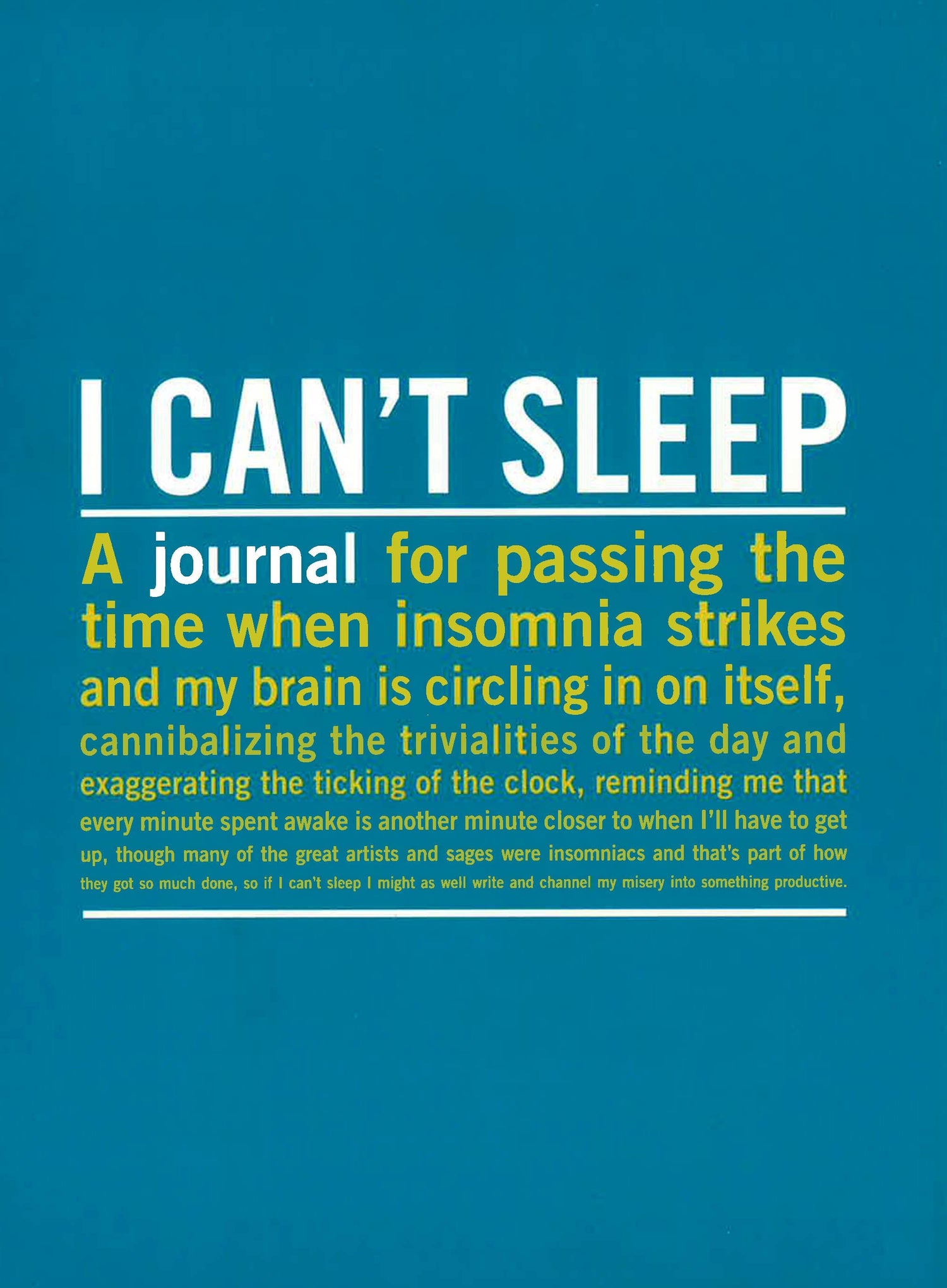 When the clock strikes midnight-or 3:00 AM-and you're still tossing and turning, a generic personal diary just won't do. Fortunately, the I Can't Sleep Inner-Truth Journal is filled with provocative prompts and candid quotations that make sleepless nights fun-or at least bearable.