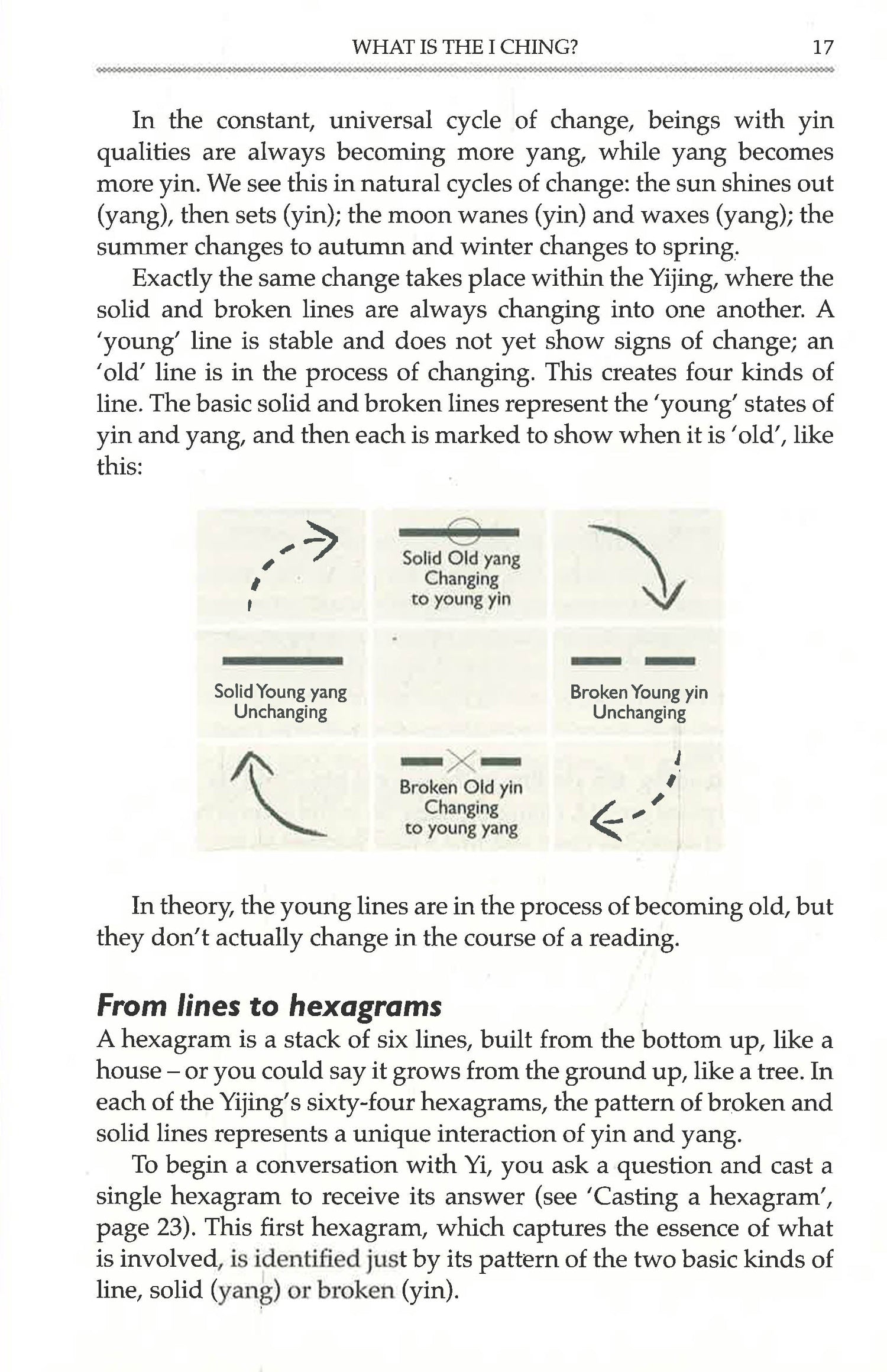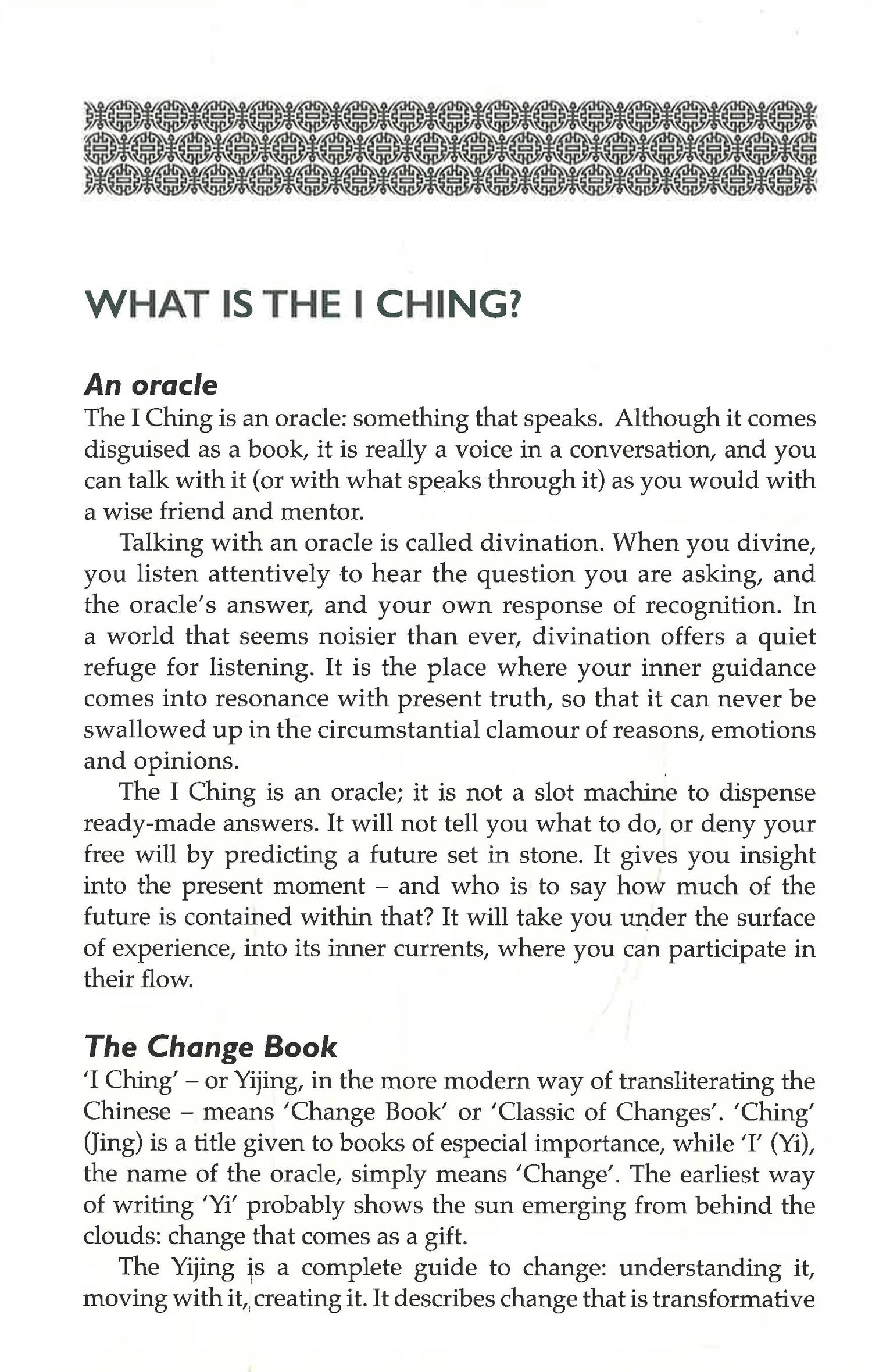 The I Ching, the ancient Chinese oracle of change, has been answering people's questions for some three thousand years. It's clarified our daily human concerns, brought out the meaning of our experience, and patiently advised on decisions.