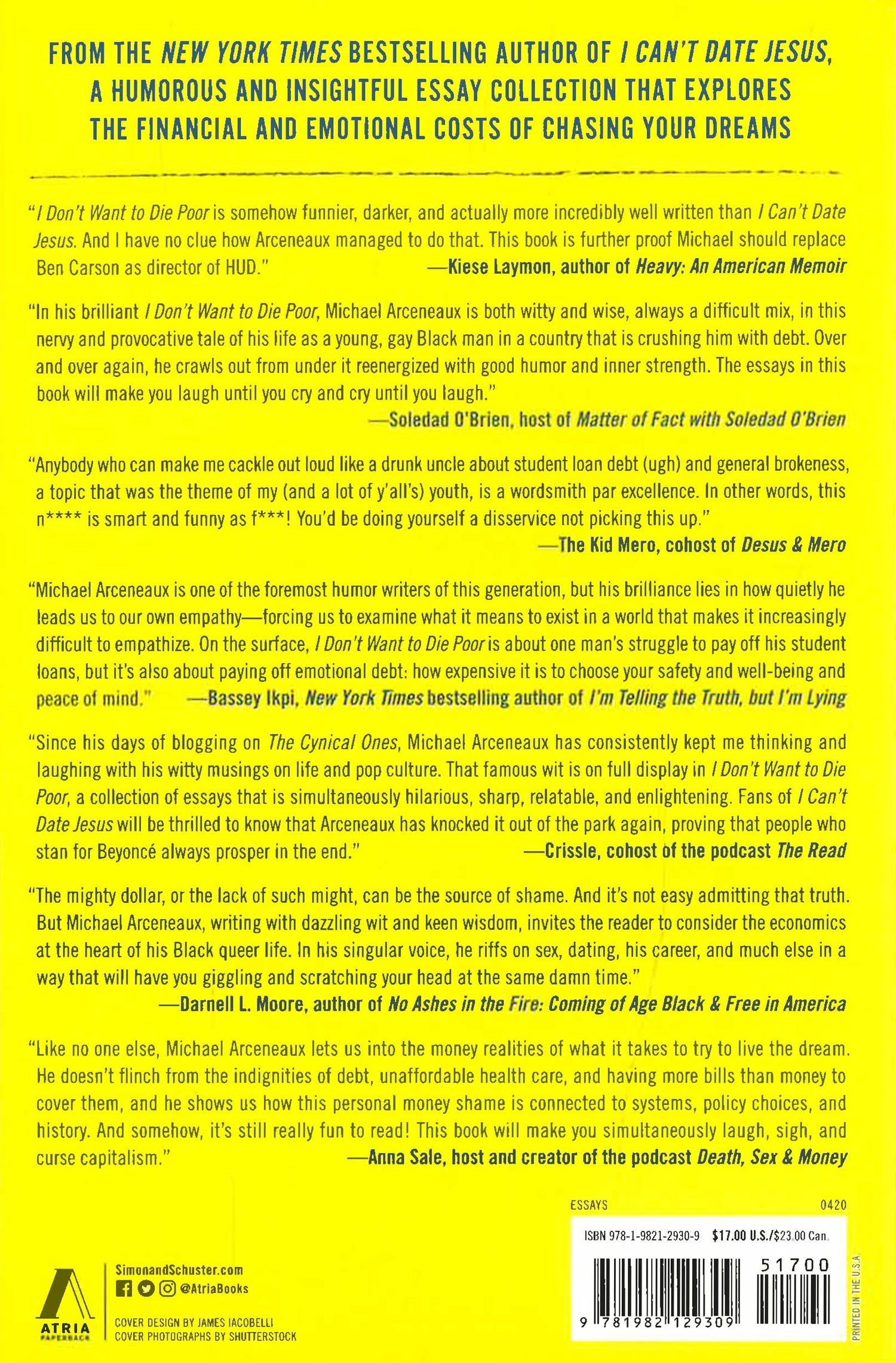 From the New York Times bestselling author of I Can't Date Jesus, which Vogue called "a piece of personal and cultural storytelling that is as fun as it is illuminating," comes a wry and insightful essay collection that explores the financial and emotional cost of chasing your dreams. Ever since Oprah Winfrey told the 2007 graduating class of Howard University, "Don't be afraid," Michael Arceneaux has been scared to death. You should never do the opposite of what Oprah instructs you to do, but when you don't have her pocket change, how can you not be terrified of the consequences of pursuing your dreams? Michael has never shied away from discussing his struggles with debt, but in I Don't Want to Die Poor, he reveals the extent to which it has an impact on every facet of his life-how he dates; how he seeks medical care (or in some cases, is unable to); how he wrestles with the question of whether or not he should have chosen a more financially secure path; and finally, how he has dealt with his "dream" turning into an ongoing nightmare as he realizes one bad decision could unravel all that he's earned. You know, actual "economic anxiety." I Don't Want to Die Poor is an unforgettable and relatable examination about what it's like leading a life that often feels out of your control. But in Michael's voice that's "as joyful as he is shrewd" (BuzzFeed), these razor-sharp essays will still manage to make you laugh and remind you that you're not alone in this often intimidating journey.