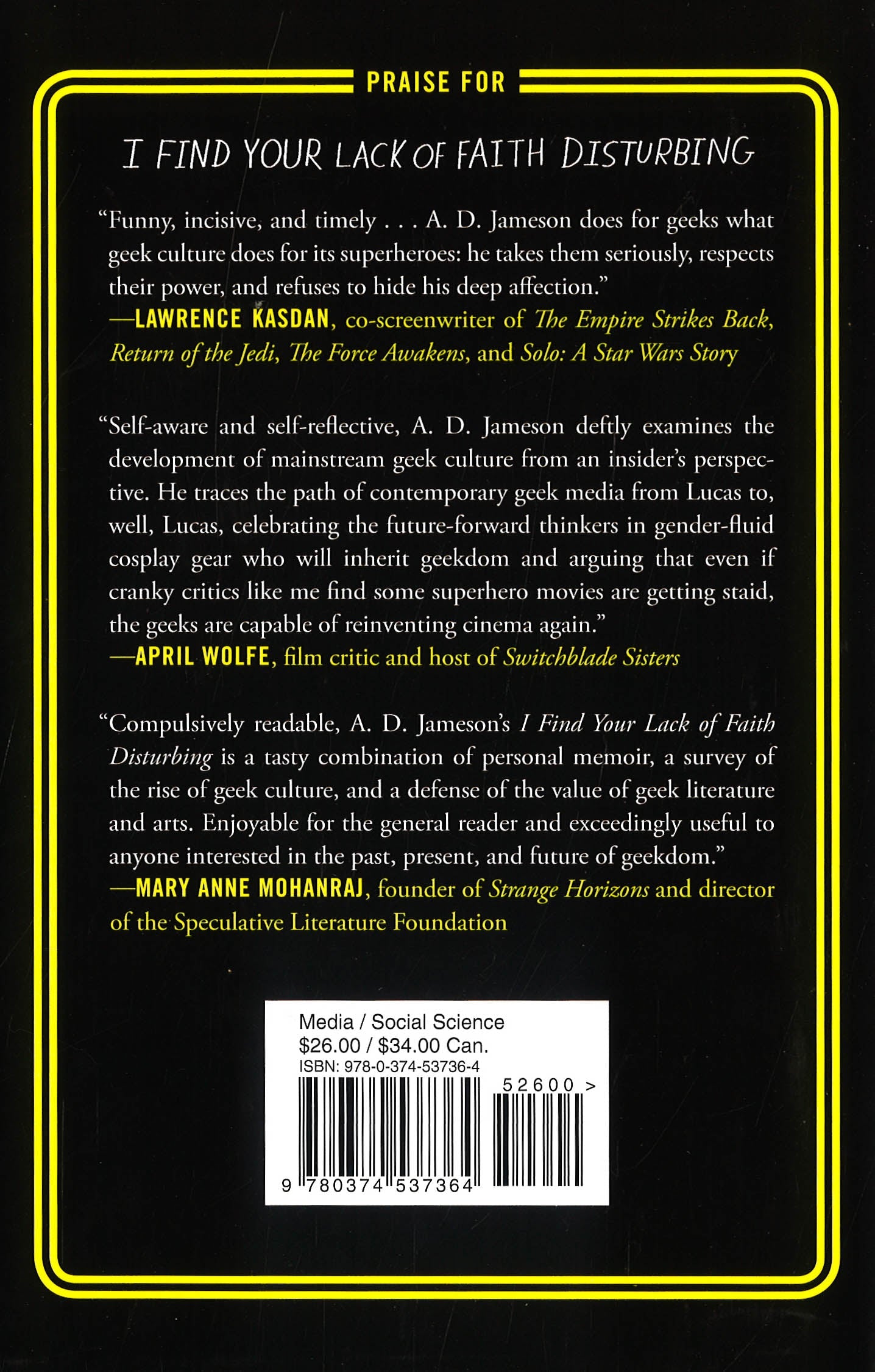 A lifelong geek lays out the history and aesthetic of this geekiest of moments in popular culture, beginning and ending with surprising new readings of Star Wars, the big bang of contemporary fandom.A. D. Jameson celebrates the triumph of geekdom in I Find Your Lack of Faith Disturbing, an insightful and irreverent journey through the science fiction, fantasy, and superhero pop-culture cinematic icons whose legions of fans have put them at the top of the box office over and over. Star Wars, Marvel superheroes, The Lord of the Rings - properties that were once supposedly the domain of socially maladroit youth have become mainstream entertainment, enjoyed by enormous audiences and by more than a few film critics too. But there are those commentators who have decried the way in which serious adult cinema has seemingly vanished, with Hollywood dominated by mindless kiddie fare such as tent-pole-event movies, franchises, and endless remakes and reboots. As a lifelong geek, A. D. Jameson blasts through the cliches that have always surrounded pop-culture phenomena: that fans are mindless followers who will embrace all things Spider-Man, regardless of quality; or that the popularity and financial success of nerd cinema represents the death of ambitious film-making. Instead, he makes a case for why genre films are worthy of serious critical attention - and shares his thoughts on where their true flaws lie. Shining a new light on beloved classics, and exploding misconceptions as to their historical and intellectual value, I Find Your Lack of Faith Disturbing explores how the geek inherited the earth.