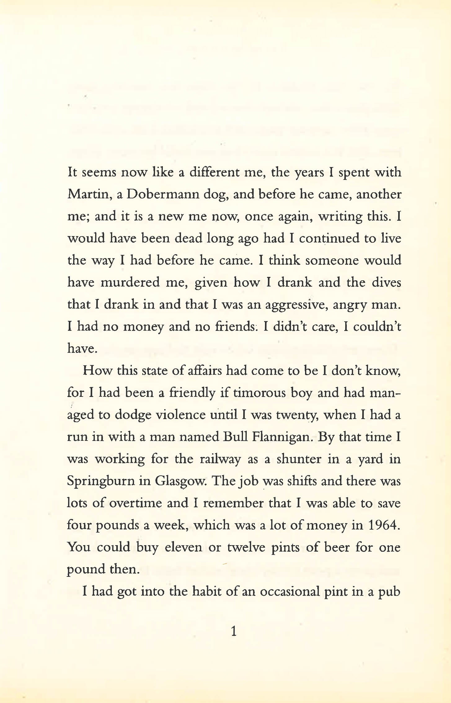 Thomas Healy was a drunk, a fighter, often unemployed, no stranger to the Glasgow police or to the courts. He came from the Gorbals, that byword for hard men and the school of hard knocks, and his life was going nowhere other than downhill. Then one day, he bought a pup - a Doberman. He called him Martin. Gradually man and dog became unshakeable allies, the closest of comrades, the best of friends. Martin, in more ways than one, saved Thomas Healy's life. This is a story of one man and his dog. Such things can be sentimental. Healy's is a memoir written with refreshing originality and love.