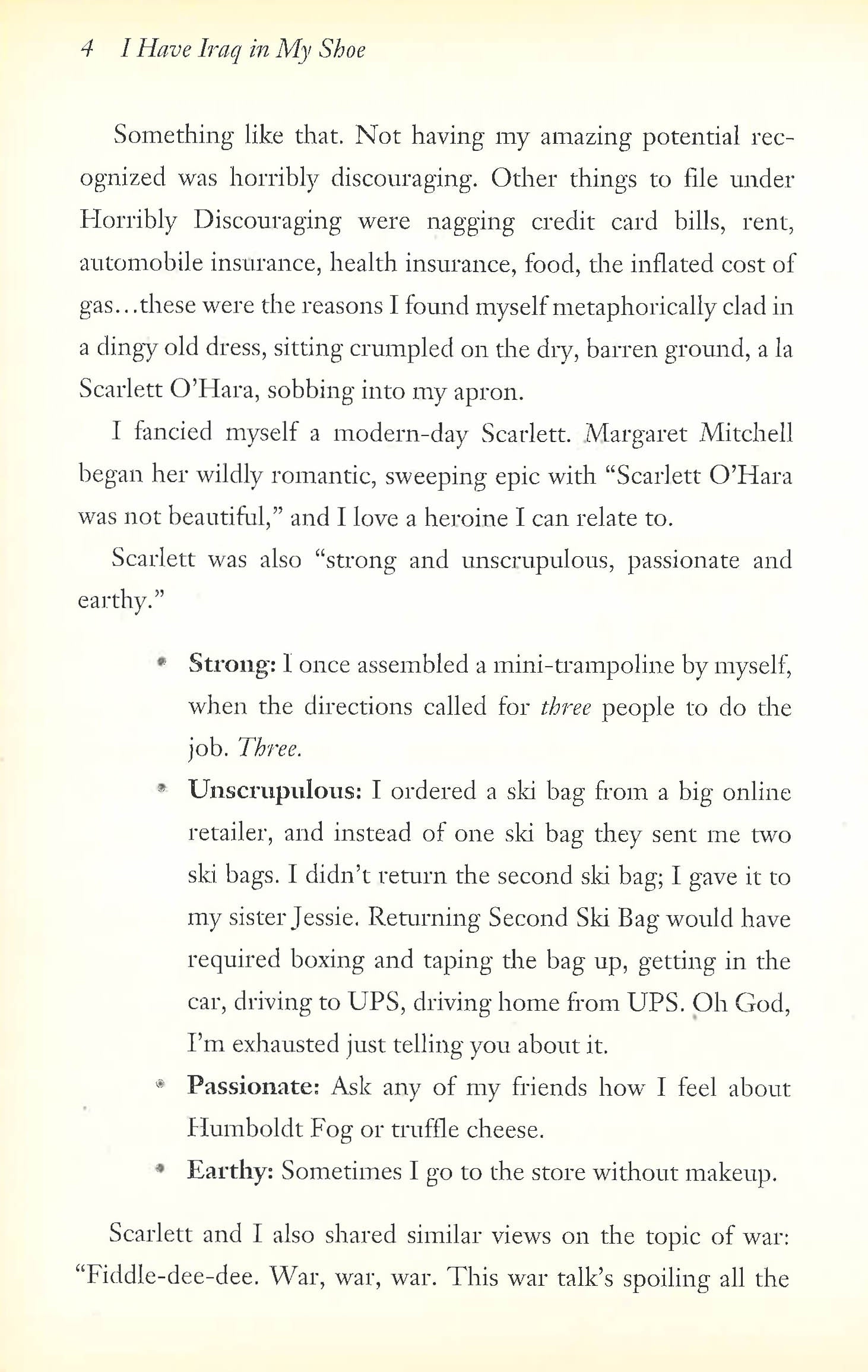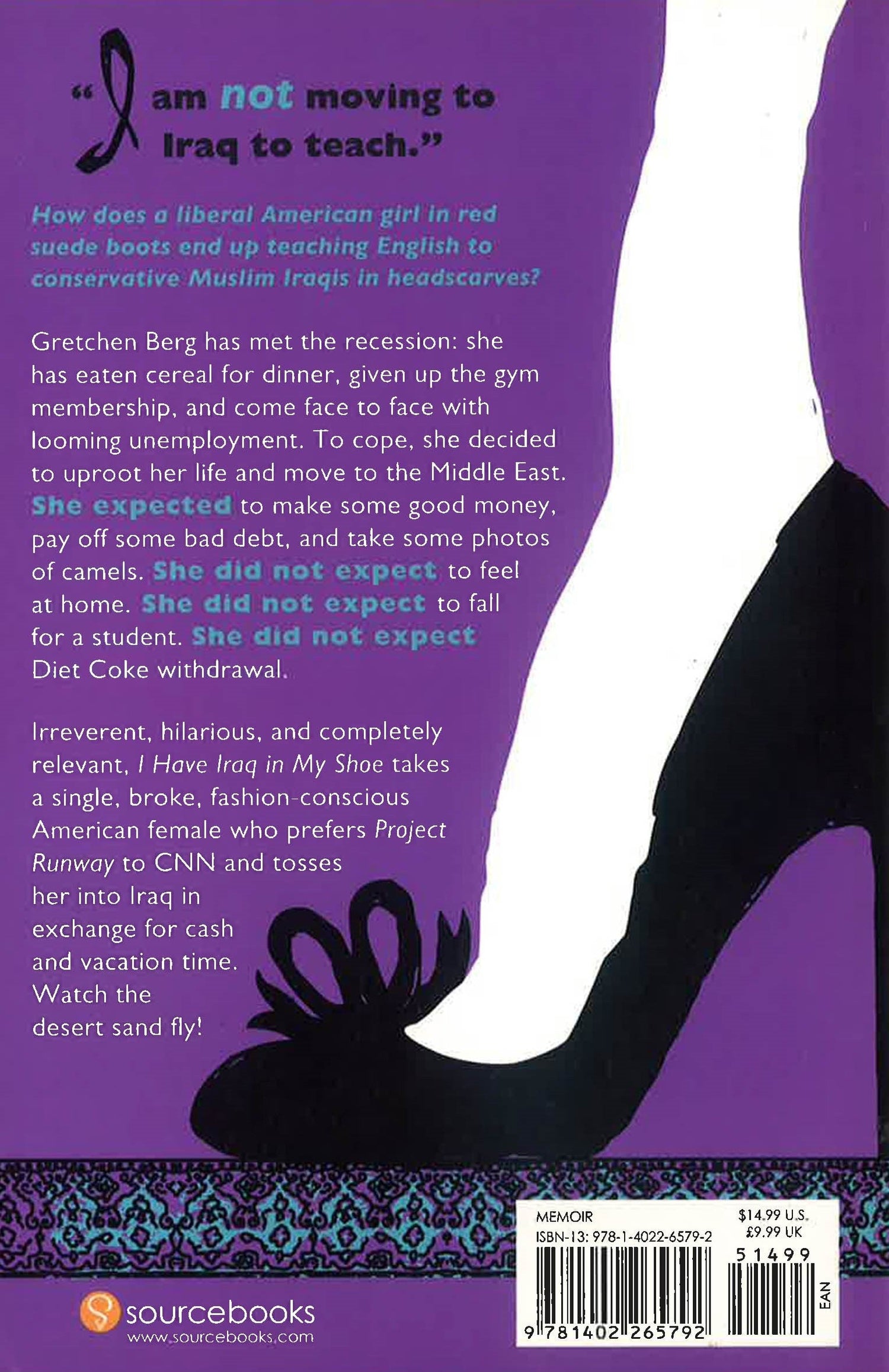 I am not moving to Iraq to teach. How does a liberal American girl in red suede boots end up teaching English to conservative Muslim Iraqis in headscarves? Gretchen Berg has met the recession: she has eaten cereal for dinner, given up the gym membership, and come face to face with looming unemployment. To cope, she decided to uproot her life and move to the Middle East. She expected to make some good money, pay off some bad debt, and take some photos of camels. She did not expect to feel at home. She did not expect to fall for a student. She did not expect Diet Coke withdrawal. Irreverent, hilarious, and completely relevant, I Have Iraq in My Shoe takes a single, broke, fashion-conscious American female who prefers Project Runaway to CNN and tosses her into Iraq in exchange for cash and vacation time. Watch the desert sand fly!