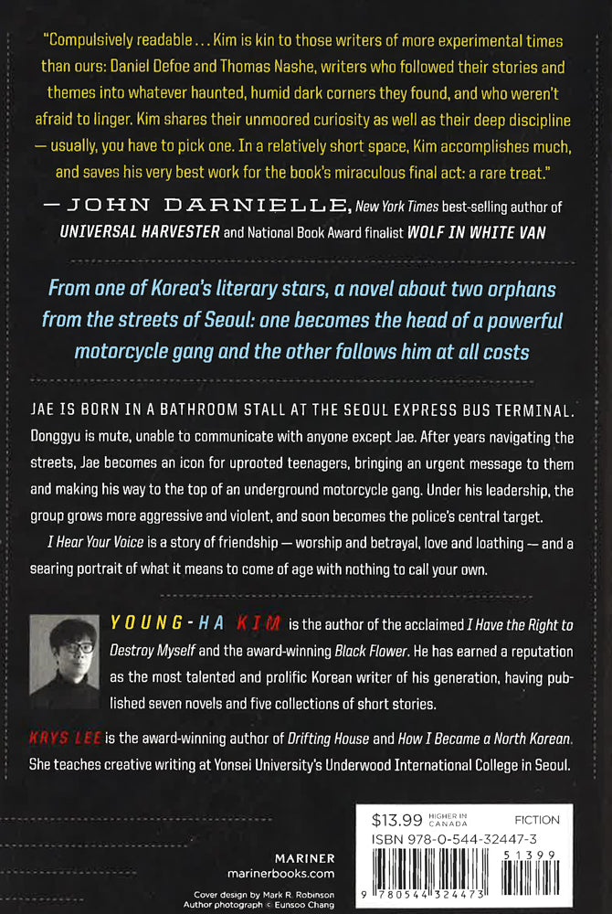 From one of Korea's literary stars, a novel about two orphans from the streets of Seoul: one becomes the head of a powerful motorcycle gang, and the other follows him at all costs In South Korea, underground motorcycle gangs attract society's castoffs. They form groups of hundreds and speed wildly through cities at night. For Jae and Dongyu, two orphans, their motorcycles are a way of survival. Jae is born in a bathroom stall at the Seoul Express Bus Terminal. And Dongyu is born mute--unable to communicate with anyone except Jae. Both boys grow up on the streets of Seoul among runaway teenagers, con men, prostitutes, religious fanatics, and thieves. After years navigating the streets, Jae becomes an icon for uprooted teenagers, bringing an urgent message to them and making his way to the top of the gang. Under his leadership, the group grows more aggressive and violent--and soon becomes the police's central target. A novel of friendship--worship and betrayal, love and loathing--and a searing portrait of what it means to come of age with nothing to call your own, I Hear Your Voice resonates with mythic power. Here is acclaimed author Young-ha Kim's most daring novel to date.
