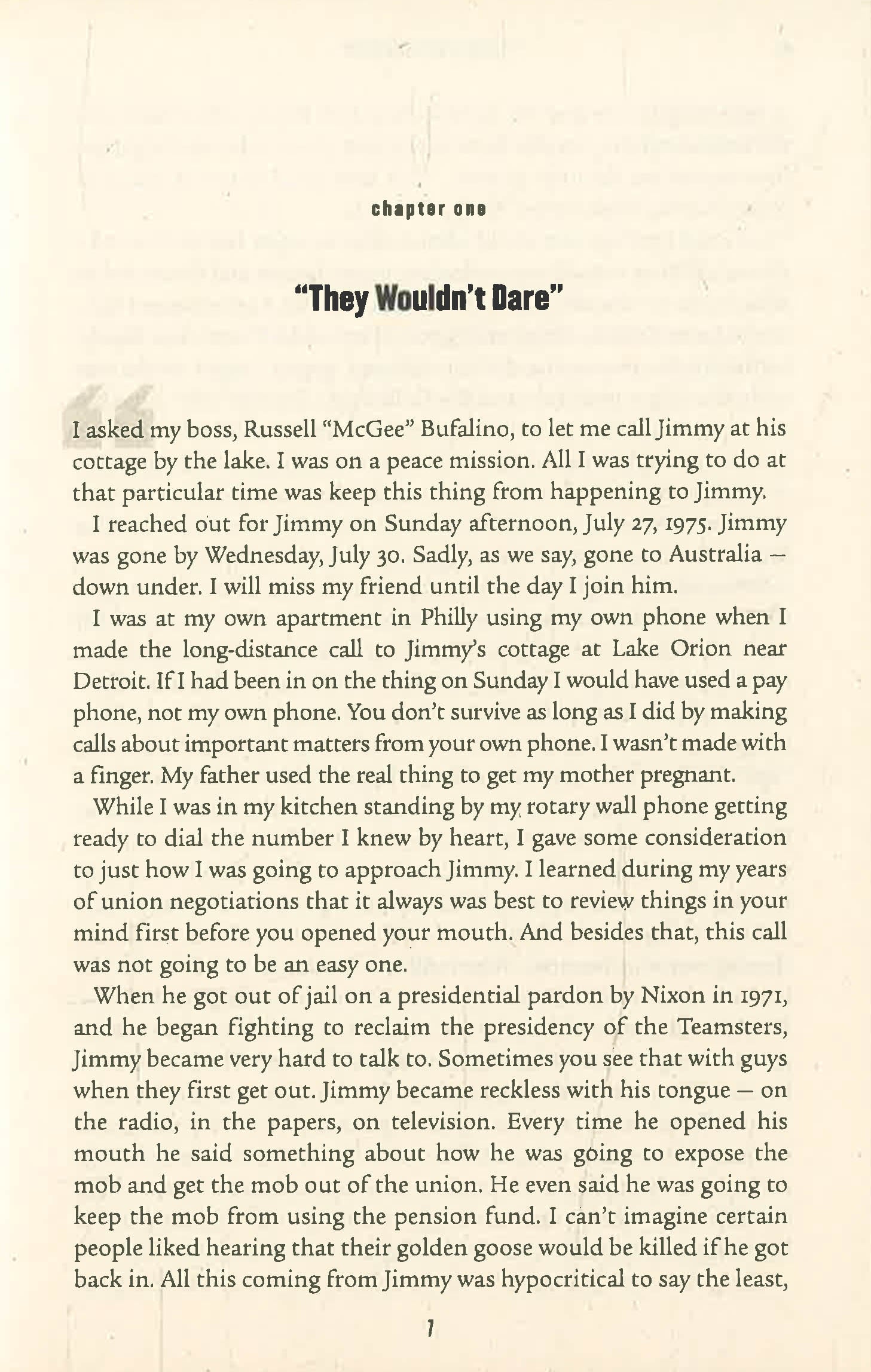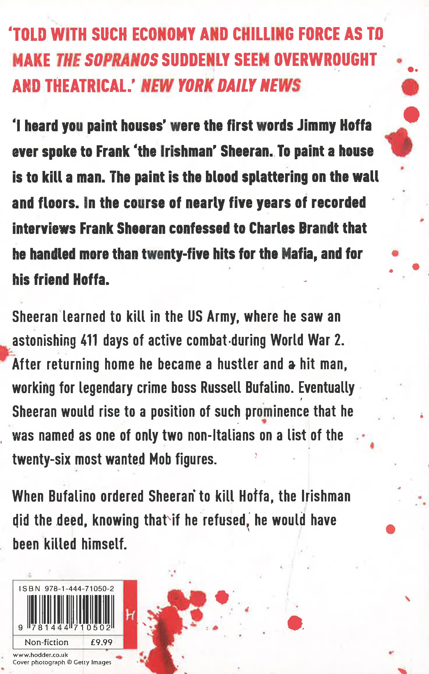 'I heard you paint houses' are the first words Jimmy Hoffa ever spoke to Frank 'the Irishman' Sheeran. To paint a house is to kill a man. The paint is the blood that splatters on the wall and floors. In the course of nearly five years of recorded interviews Frank Sheeran confessed to Charles Brandt that he handled more than twenty-five hits for the Mob, and for his friend Hoffa.