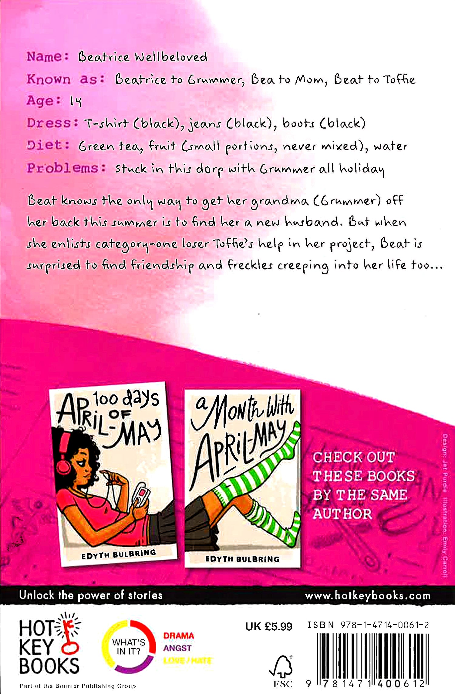 Beatrice has got a deadbeat mum, an addiction to online messaging and an aversion to the sun. If she could stay inside all summer she most absolutely would. Except she's being shipped off to stay with her 'Grummer' - a grandmother she barely knows - while her mum has another go at rehab. If Beatrice is going to have any chance of having some peace she will need to distract Grummer with a husband. Unfortunately there aren't many eligible bachelors hanging around this cranky old dorp. Her plan is simple: identify the target, establish contact and ensure eternal love. But all does not go to plan for control-freak Beat. Suddenly she finds herself ditching the factor 50 for freckles from swimming in the reservoir; her cucumber and tea-only diet is overtaken by peanut butter sandwiches, and the very important 'rely on no-one' policy has to make room for Toffie; a boy with a bike, a shock of red hair and a love for the natural fauna of South Africa. Beat always knew that love was found in unexpected places. She just never thought that it might find her.