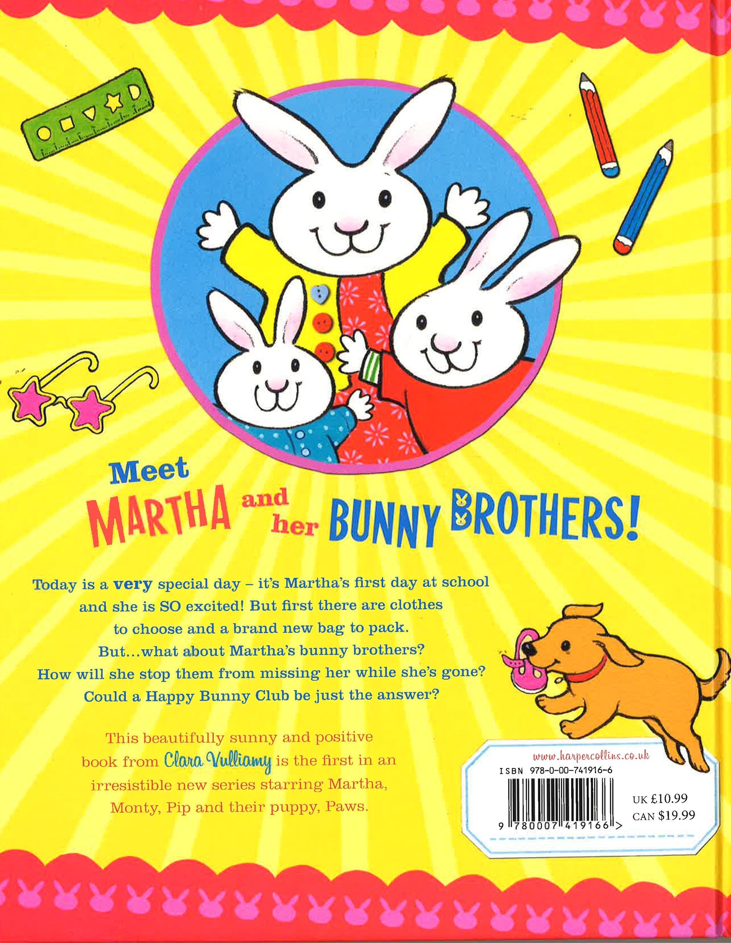 Starting school has never been so fun! The first in an exuberant, feel-good new series from Clara Vulliamy. I Heart School is pure sunshine in picture book format, every page will make you smile! The Big News in the launch title of this joy-filled new series is that it's Martha's first day of school! It's all so exciting! She needs to choose the perfect first-day-at-school outfit and decide what to pack in her new school bag, which is proving quite tricky.. Trouble is, she may be able to take her snowdome and her fairy wings and her scooter, but she has to leave behind her two not-so-happy little bunny brothers... But Martha finds room in her school bag for a very special picture that the Happy Bunny Club has made especially for her, and it's not long before she's back from school and Martha and her bunny brothers are reunited (in their secret den)! Hooray! Young readers will adore helping Martha to choose what to wear and what to take to school in these sunshine-filled pages that weave together all the little details of Martha's life, with a charming story about sibling relationships and starting school.