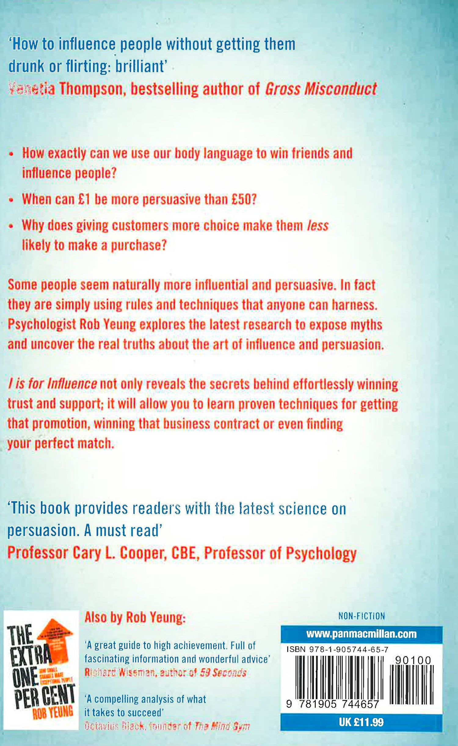 Some people are naturally gifted in the art of influence and persuasion. Why do some have it and others don't? And what is it, exactly, that makes someone and their point of view so irresistible? In fact, anyone can master the power of influence and Rob Yeung shows you how. Delving into fascinating psychology, he reveals unexpected insights including: * Why giving people more choice might make them less happy * Why telling people they 'should' do something makes them less likely to do it * Why offering something for free makes it less desirable * When GBP1 is more persuasive than GBP50 Revealing the secrets behind effortlessly winning trust and support, I is for Influence will open doors to endless potential in your life, whether it's getting that promotion, winning that business contract or finding your perfect match. By the bestselling author of Confidence and The Extra One Per Cent (Macmillan, 2010).