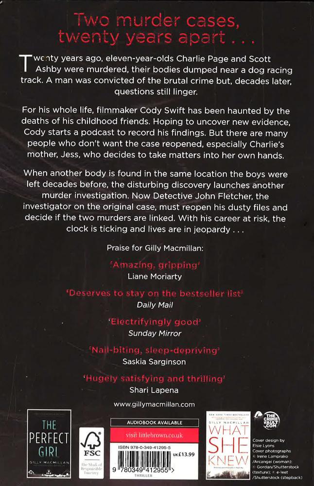From New York Times bestselling author Gilly Macmillan comes this original, chilling and twisty mystery about two shocking murder cases twenty years apart, and the threads that bind themFor fans of Serial and Making a Murderer comes this clever, twisty and innovative new thriller by New York Times bestselling author Gilly Macmillan.'Vivid, smart, propulsive. A thoroughly immersive thriller' Lisa Unger, New York Times bestselling author Twenty years ago, eleven-year-olds Charlie Page and Scott Ashby were murdered, their bodies dumped near a dog racing track. A man was convicted of the brutal crime but, decades later, questions still linger.For his whole life, filmmaker Cody Swift has been haunted by the deaths of his childhood friends. Hoping to uncover new evidence, Cody starts a podcast to record his findings. But there are many people who don't want the case reopened, especially Charlie's mother, Jess, who decides to take matters into her own hands.When another body is found in the same location the boys were left decades before, the disturbing discovery launches another murder investigation. Now Detective John Fletcher, the investigator on the original case, must reopen his dusty files and decide if the two murders are linked. With his career in jeopardy, the clock is ticking and lives are in jeopardy...Praise for Gilly Macmillan: 'Amazing, gripping, beautifully written' Liane Moriarty'Deserves to stay on the bestseller list' Daily Mail'Electrifyingly good. An absolute firecracker of a thriller' Sunday Mirror'A nail-biting, sleep-depriving, brilliant read' Saskia Sarginson, bestselling author of The Twins'Literary suspense at its finest' Mary Kubica'Deceptively clever' Rosamund Lupton'Utterly gripping' Tim Weaver