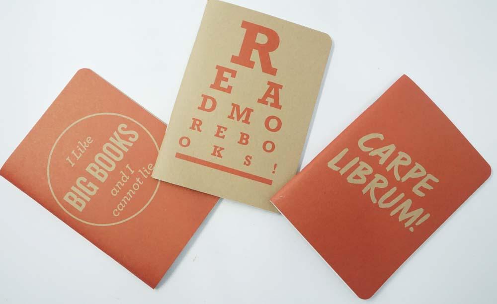Three unique cover designs include, I like big books and I cannot lie, Read More Books eye chart, and Carpe Librum!
