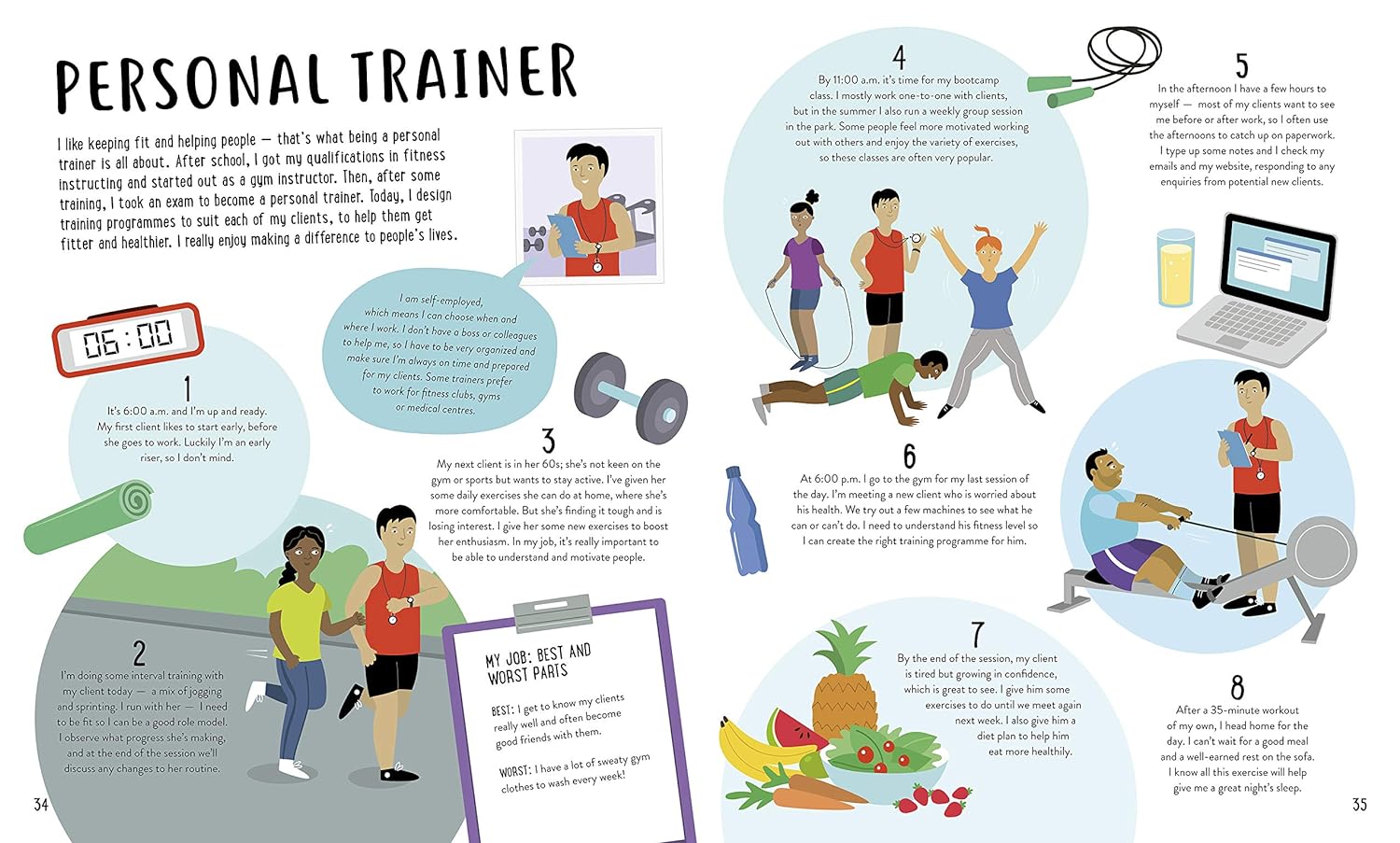 In this entertaining and informative book, children who love sport can find out all about the future careers they can choose from. From being a swimming instructor, a referee, a sport nutritionist, a race car mechanic, to a sport photographer and many more, this book will take you through a day in the life of 25 sporty workers, showing you how each job unfolds on a typical working day. You'll learn what it takes to get the job, what duties and tasks are involved, and discover a world of opportunities. Turn the pages and find out the best part of a lifeguard's day and what really bothers a personal trainer... HINT: it involves stinky gym clothes!