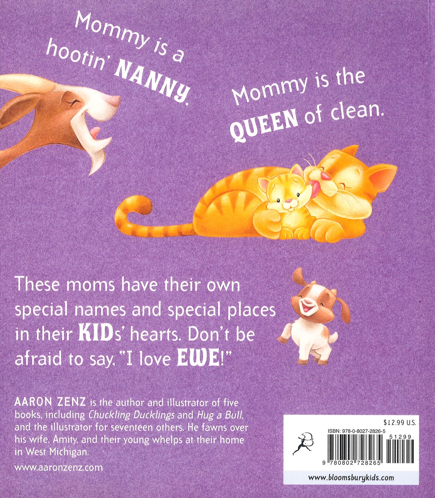 From geese to kangaroos to humans, every mom and dad is known by his or her own special name. Bouncing texts full of fun wordplay and adorable illustrations feature animal parents of every shape and size, and encourage little readers to express big love. Go ahead and hug a bull! Don't be afraid to say I love ewe!
