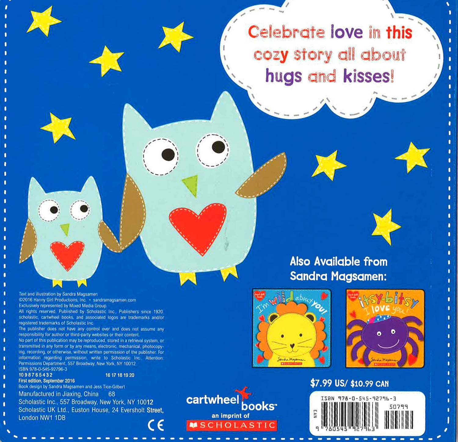 Featuring adorable animals of every shape and size -- from sweet pandas and foxes to owls and ducks -- everyone is ready for hugs and kisses everywhere they go! With huggable felt panda ears and arms on the front cover, and bold, graphic art on every page, combined with Sandra's warm and reassuring message of love, this is the perfect book for cuddling up with little ones and lavishing them with the hugs and kisses they adore.