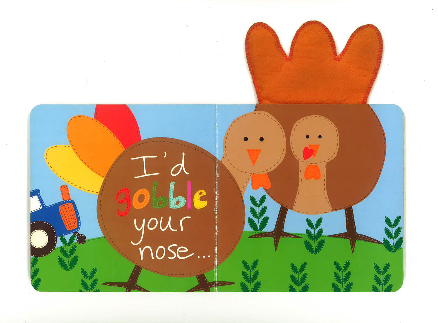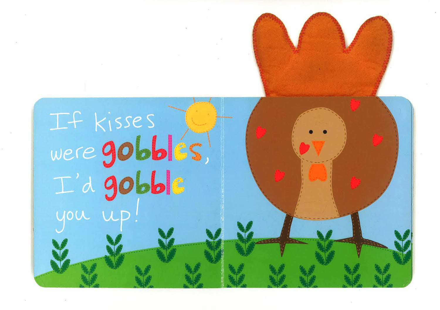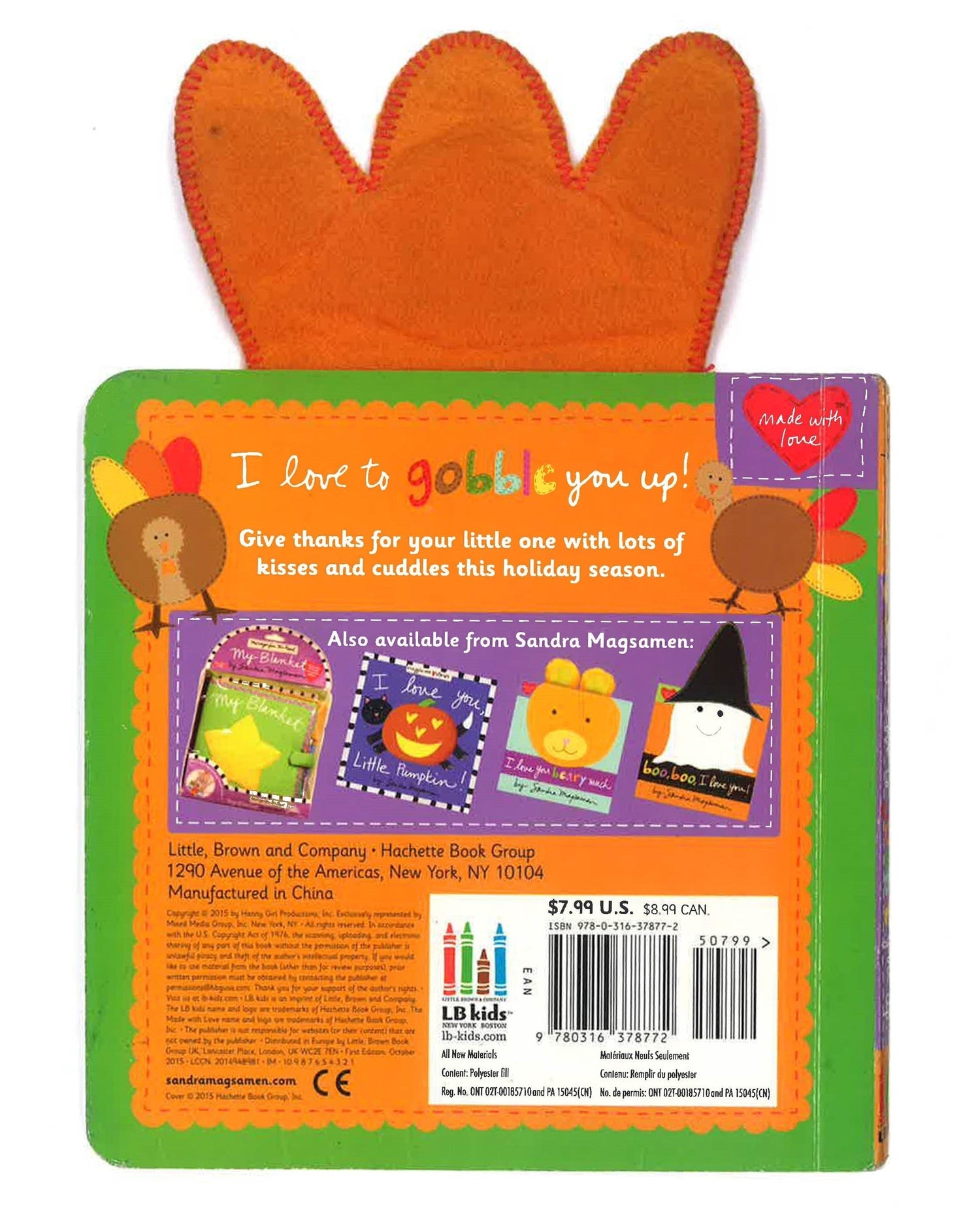 If kisses were gobbles, I'd gobble you up! Say hello to a silly turkey in Sandra Magsamen's first Thanksgiving book! Featuring sturdy board book pages and soft, felt turkey feathers, this is the perfect book to share with little ones as you give thanks this season.