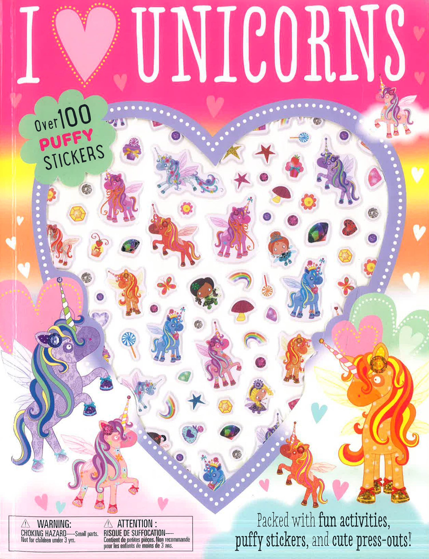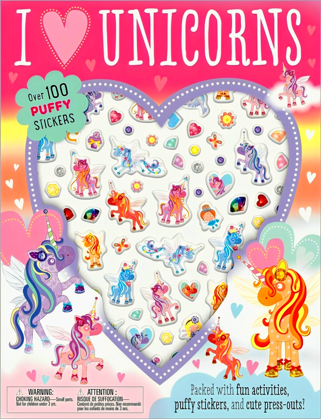 A unicorn-themed activity book with card press-outs and 3-D (puffy) stickers.