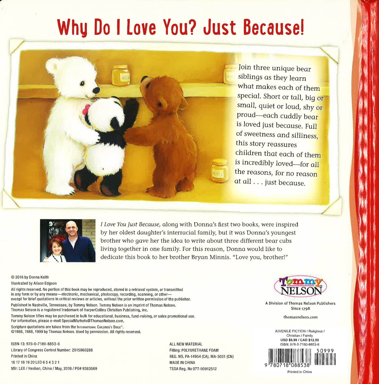 The third book in this adorable series, I Love You Just Because is the perfect way to show kids that their parents love them just because. With sales of nearly 75,000 copies for the first two I Love You . . . books, this third addition uses sweet, playful art to depict family dynamics that are grounded in unconditional love. Through adorable, cuddly art and fun rhyming text, I Love You Just Because will help little ones understand their parents' love for them and that it doesn't have to be earned. With playful artwork and the same friendly bear family you already know and love from Donna Keith's first two books--I Love You All the Same and I Love You Even When--the sweet story of this book will touch you and your family and will remind you that family members love each other...just because. Parents will gravitate toward the felt need and fun messaging of this book as it seeks to help them explain to their little ones that they are truly loved just because.