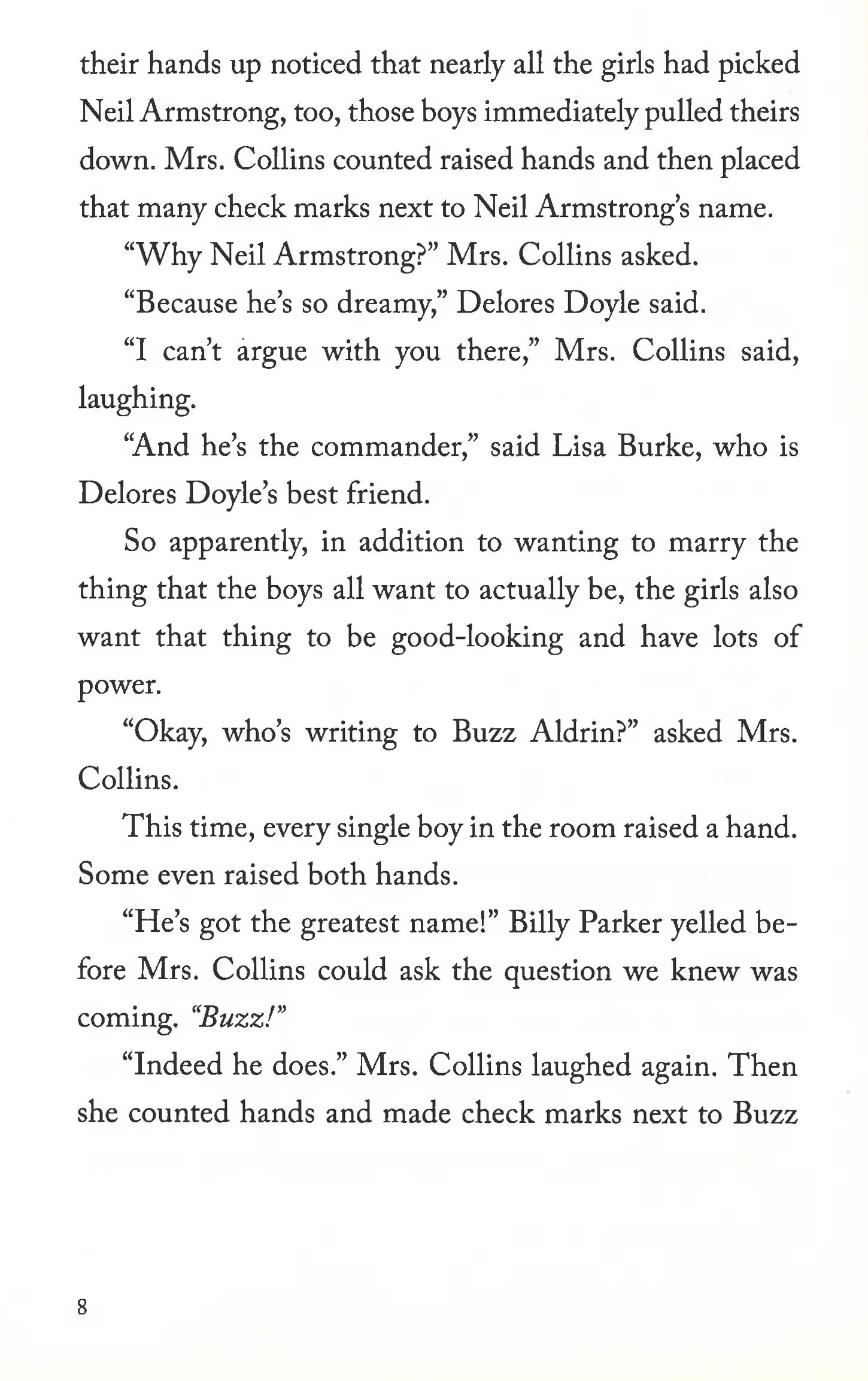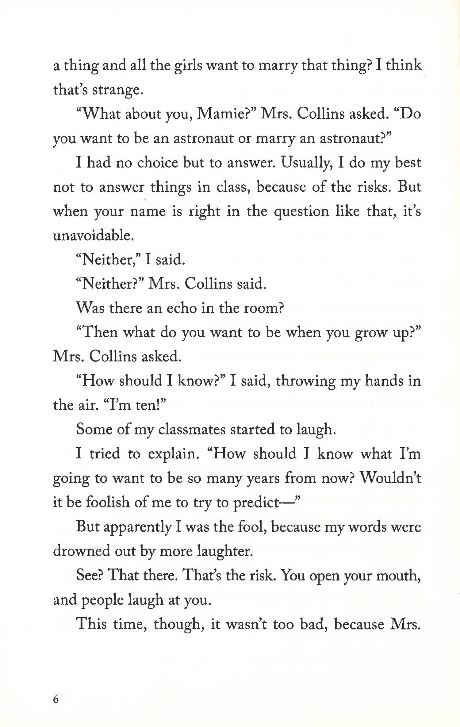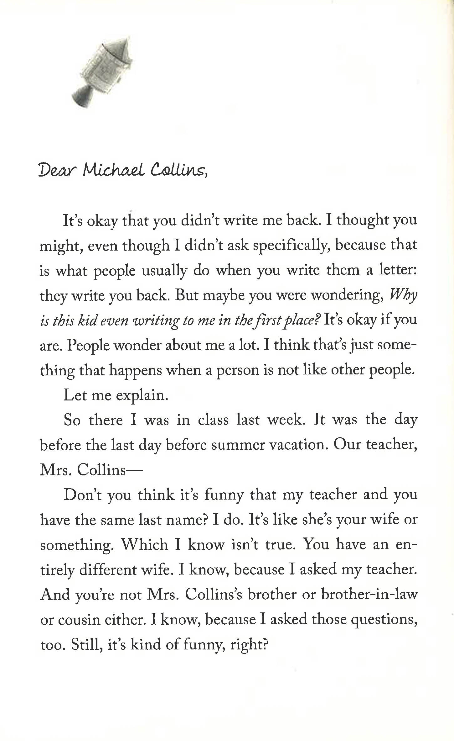 It's 1969 and the country is gearing up for what looks to be the most exciting moment in U.S. history: men landing on the moon. Ten-year-old Mamie's class is given an assignment to write letters to the astronauts. All the girls write to Neil Armstrong ("So cute!") and all the boys write to Buzz Aldrin ("So cool!"). Only Mamie writes to Michael Collins, the astronaut who will come so close but never achieve everyone else's dream of walking on the moon, because he is the one who must stay with the ship. After school ends, Mamie keeps writing to Michael Collins, taking comfort in telling someone about what's going on with her family as, one by one, they leave the house thinking that someone else is taking care of her - until she is all alone except for her cat and her best friend, Buster. And as the date of the launch nears, Mamie can't help but wonder: Does no one stay with the ship anymore?