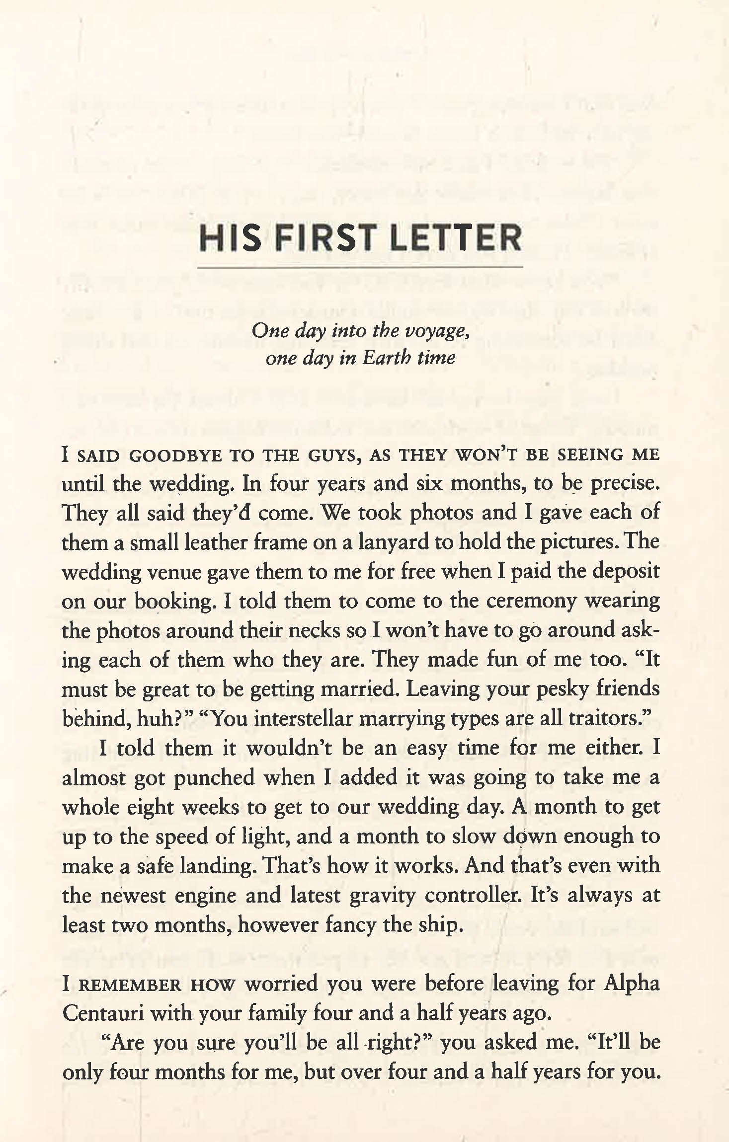 In the title story, an engaged couple working in distant corners of the galaxy plan to arrive on Earth simultaneously and walk down the aisle together. But small incidents wreak havoc on their vast journeys, pushing the date of their wedding far into the future. As centuries pass on Earth and the land and climate change, one thing is constant: the desire of the lovers to be together.