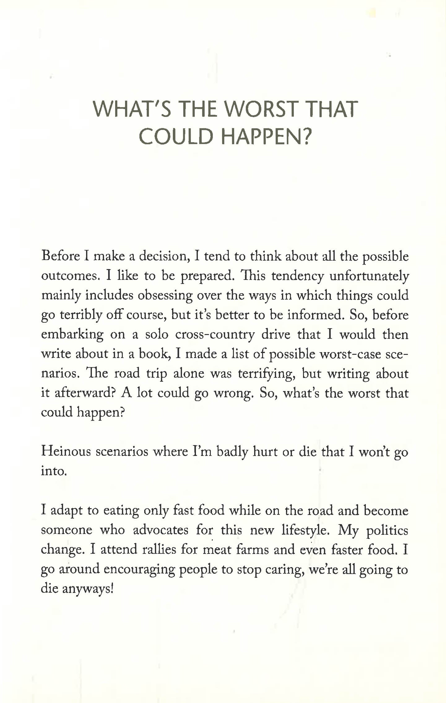A NEW YORK TIMES BESTSELLERFrom the co-creator and co-star of the hit series Broad City, a hilarious and poignant collection about love, loss, work, comedy and figuring out who you really are when you thought you already knew.When Abbi Jacobson announced to friends and acquaintances that she planned to drive across the country alone, she was met with lots of questions and opinions: Why wasn't she going with friends? Wouldn't it be incredibly lonely? The North route is better! Was it safe for a woman? The Southern route is the way to go! You should bring mace! And a common one . . . why? But Abbi had always found comfort in solitude, and needed space to step back and hit the reset button. As she spent time in each city and town on her way to Los Angeles, she mulled over the big questions - What do I really want? What is the worst possible scenario in which I could run into my ex? How has the decision to wear my shirts tucked in been pivotal in my adulthood? In this collection of anecdotes, observations and reflections - all told in the sharp, wildly funny and relatable voice that has endeared Abbi to critics and fans alike - readers will feel like they're in the passenger seat on a fun and, ultimately, inspiring journey. With some original illustrations by the author.