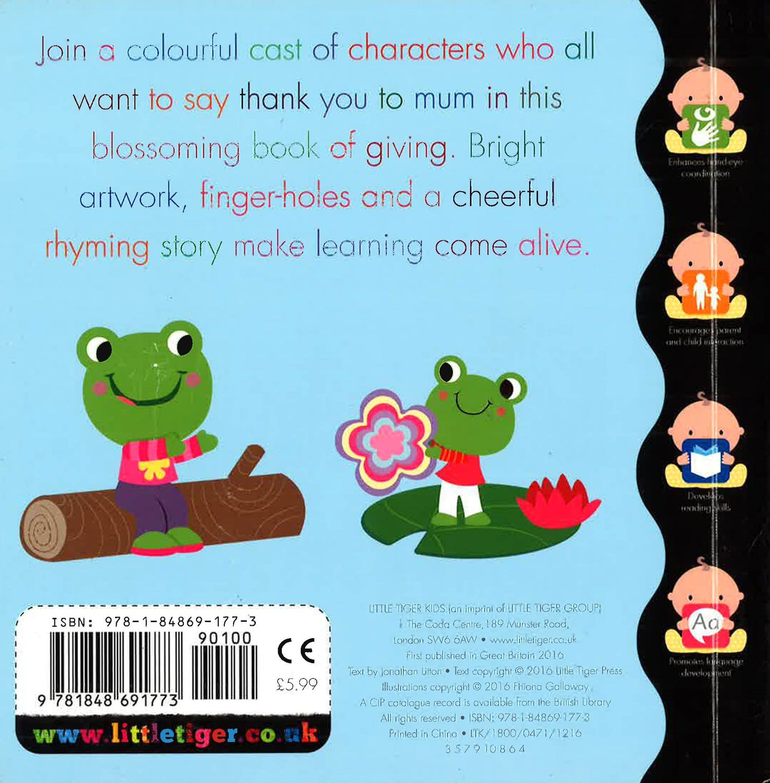 Join a colourful cast of characters who all want to say thank you to their mummy in this blossoming book of giving. The bright artwork from Fhiona Galloway, finger holes and cheerful rhyming text help make learning come to life.