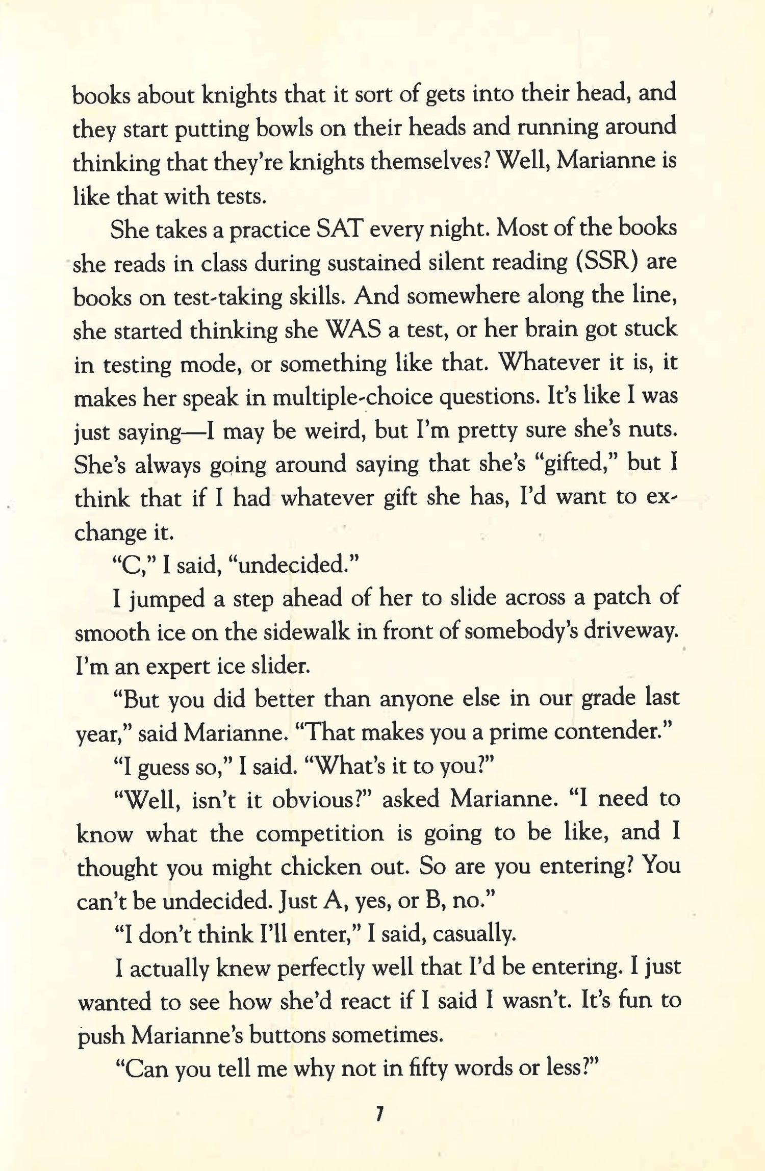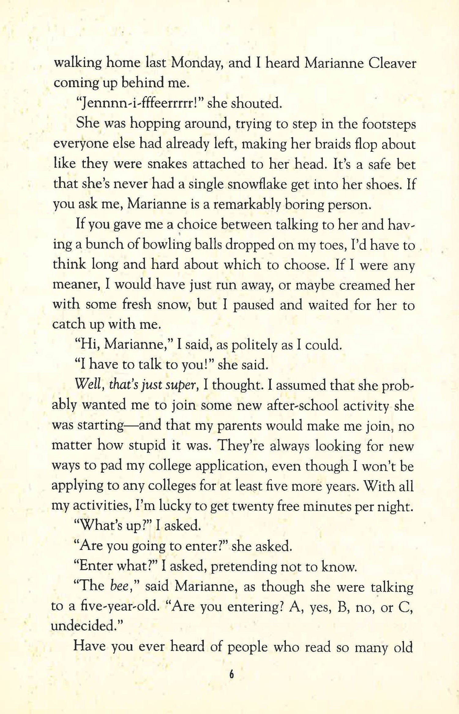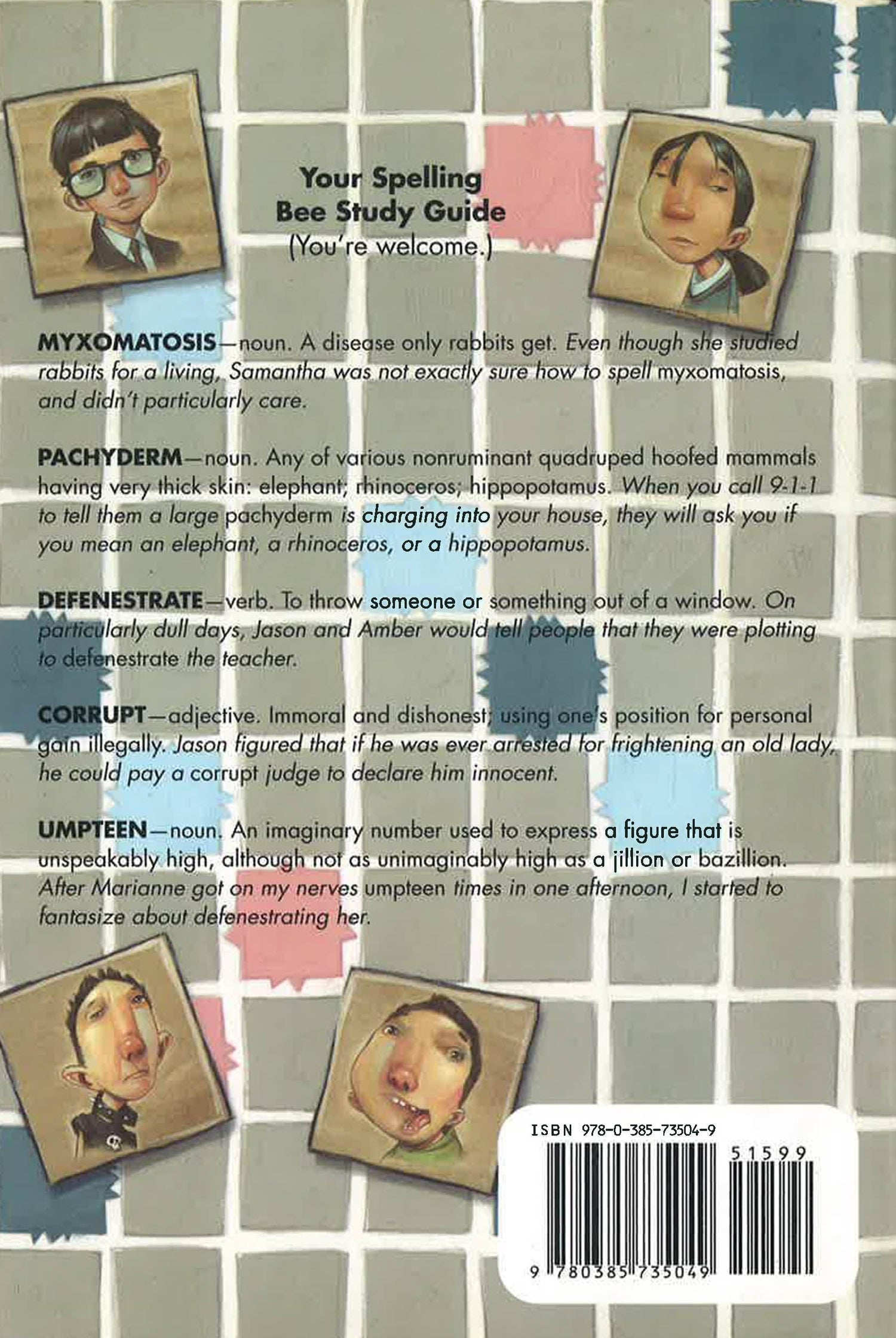 COME SPELLING BEE season, the tiny town of Preston erupts in excitement: the bee is televised, and the hottest ticket in town. This year, an assortment of sixth-grade miscreants is going for the top prize: Jennifer, an overscheduled free spirit whose parents are obsessed with her college applications; Mutual, a previously home-schooled outsider who's enrolled in public school for the first time in order to participate in the bee; Harlan, the class clown who has spectacular plans for making the most of his time in the spotlight; and Chrissie, the constant observer, who suspects something is off at the bee and will stop at nothing to get to the truth. Principal Floren is acting shady to everyone--but, as he insists, "I am not a crook."