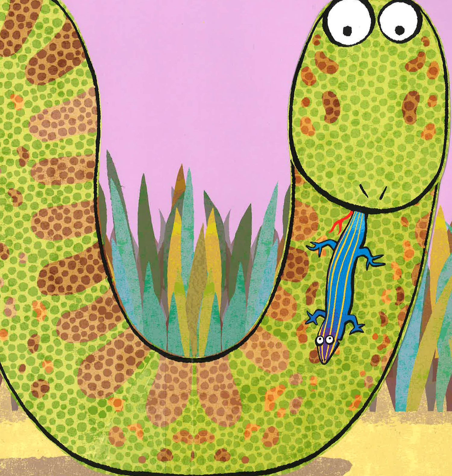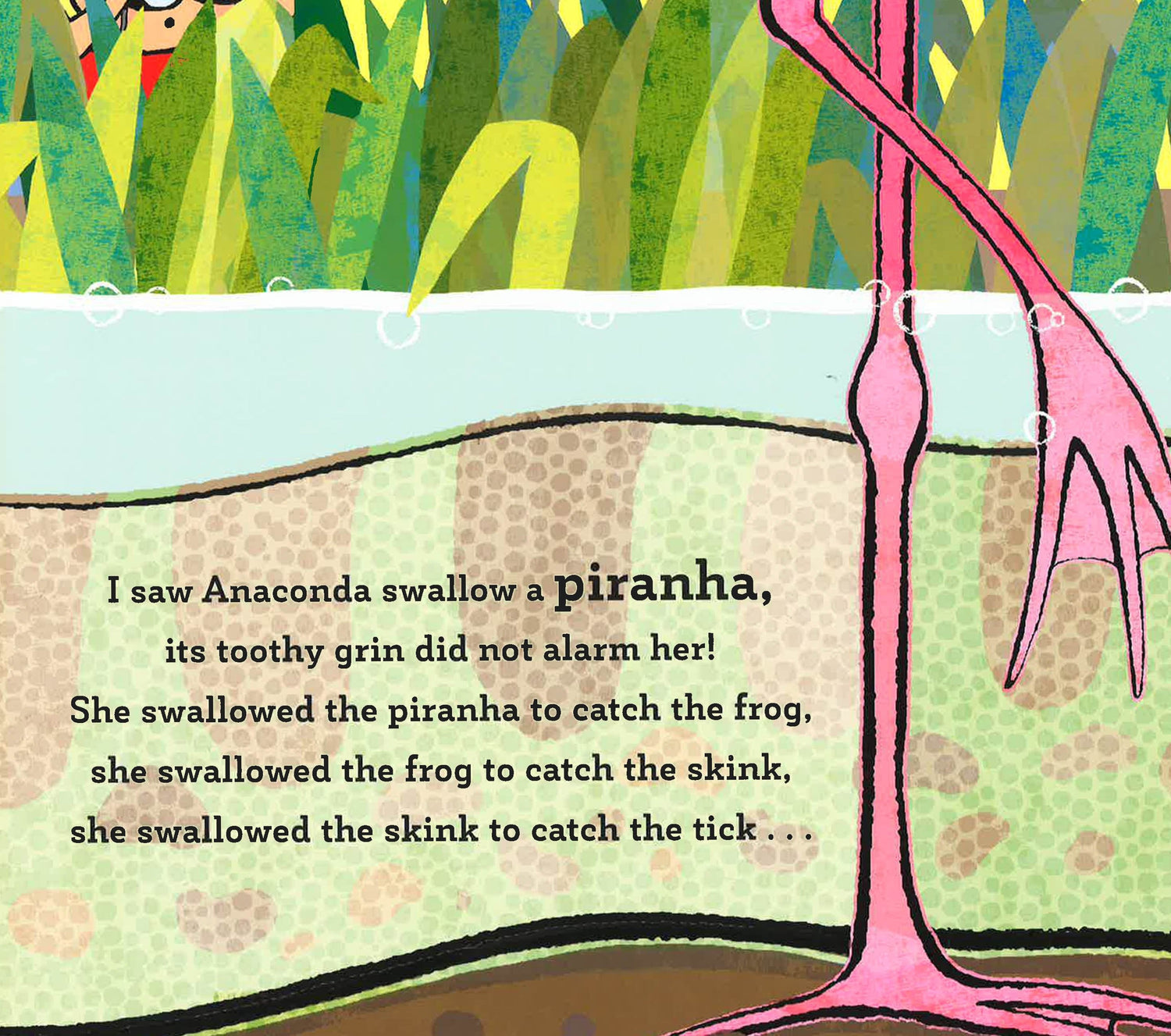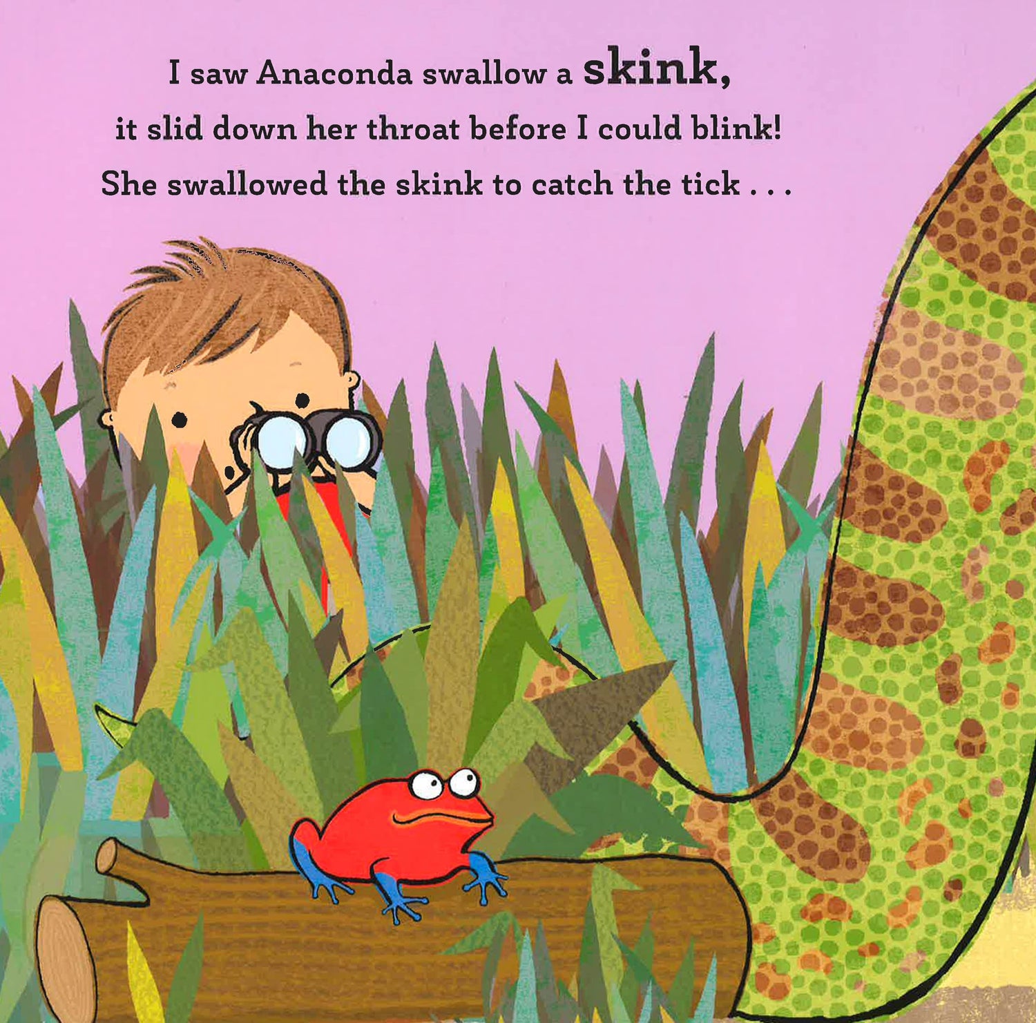 This romping, rhyming novelty book is full of odd animals and yucky flap reveals. A little boy watches as ALL SORTS of animals are swallowed up by a very hungry anaconda. But if that anaconda swallows a boy, an alligator, a stork, a piranha, a frog, a skink AND a tick . . . will she be sick?
