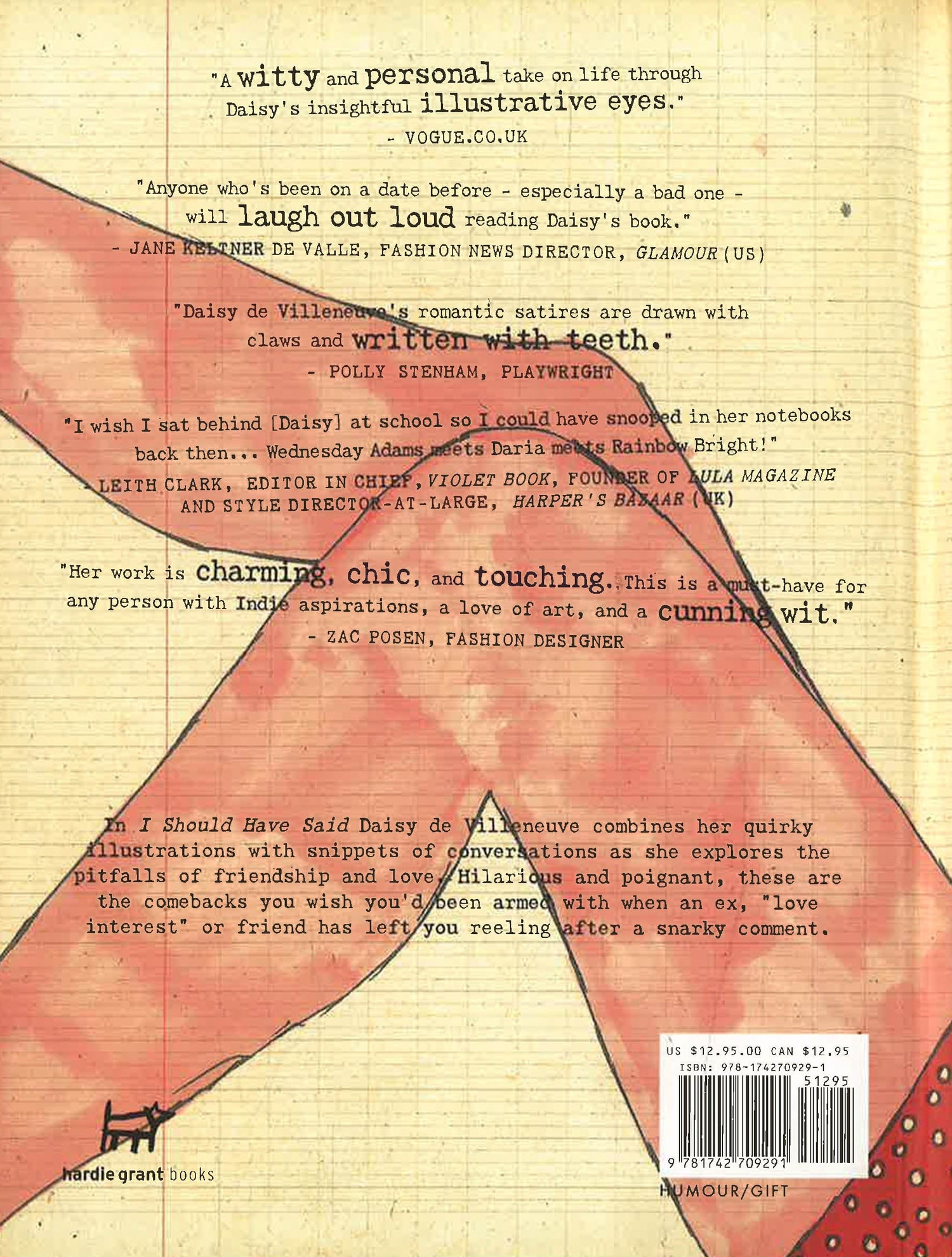 In I Should Have Said... Daisy de Villeneuve combines her quirky illustrations with unassuming snippets of dialogue between men and women, as she explores the everyday drama of modern day friendship and love. Hilarious and poignant at the same time, Daisy depicts the scenarios where you wish you had said that thing to an ex, 'love interest', or any man on the street who has left you reeling after a snarky comment. With a sketchbook, diary-style design, the pared-down but stylish illustrations are captioned with type-writing style text, guaranteed to make you laugh: