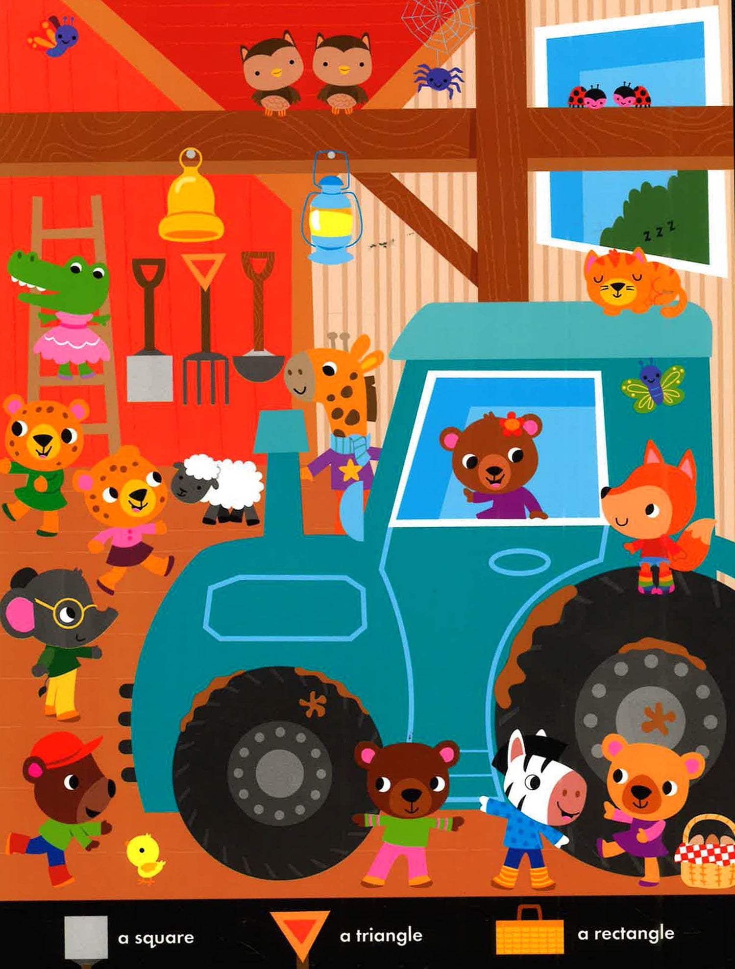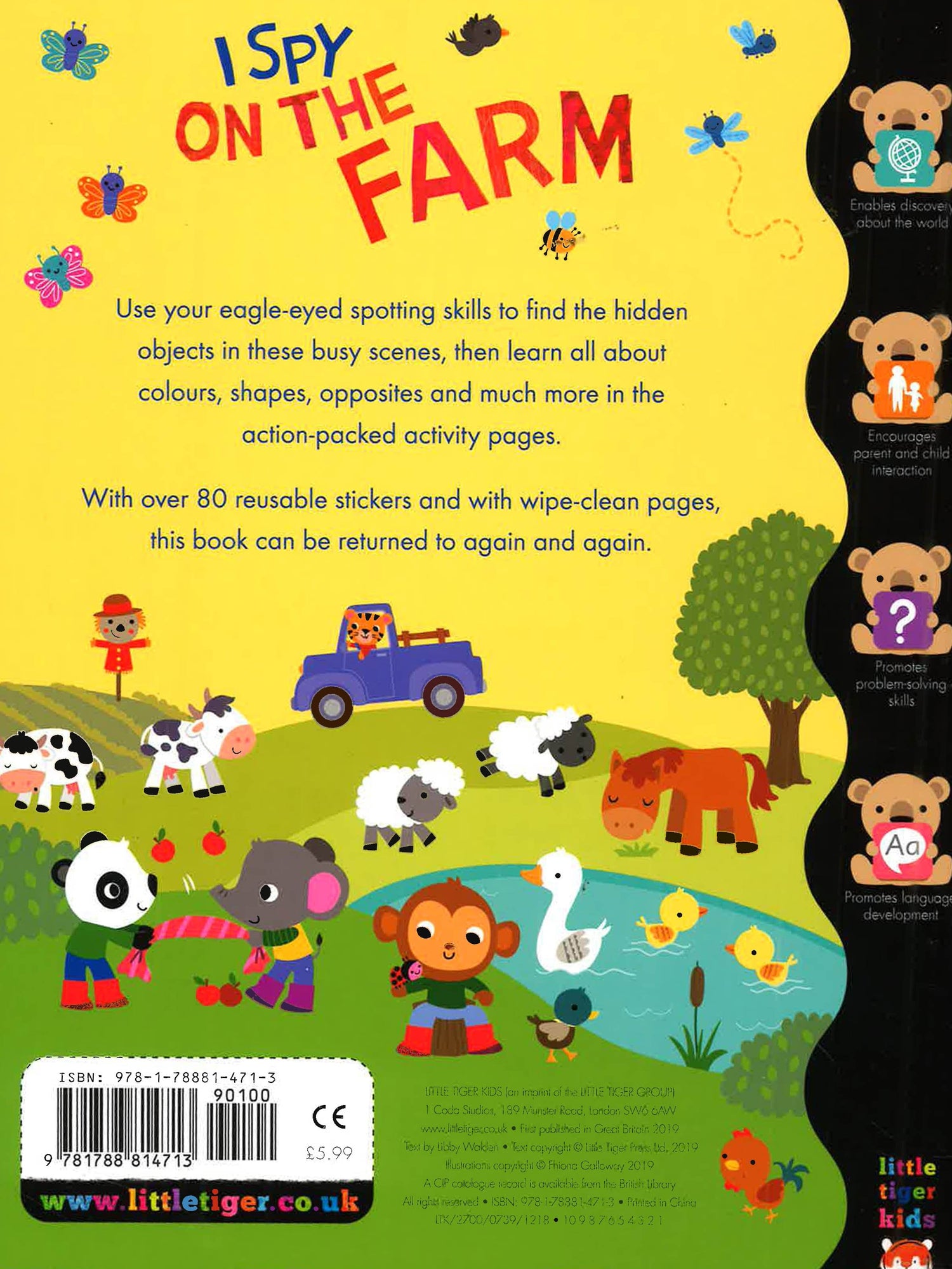 Look through each eye-catching spy hole to spot a new farmyard animal! Down on the farm there are many colorful and noisy animals to spy. Look through the spy hole and use the clues to guess which one is next. Then turn the page to reveal the animal. ?