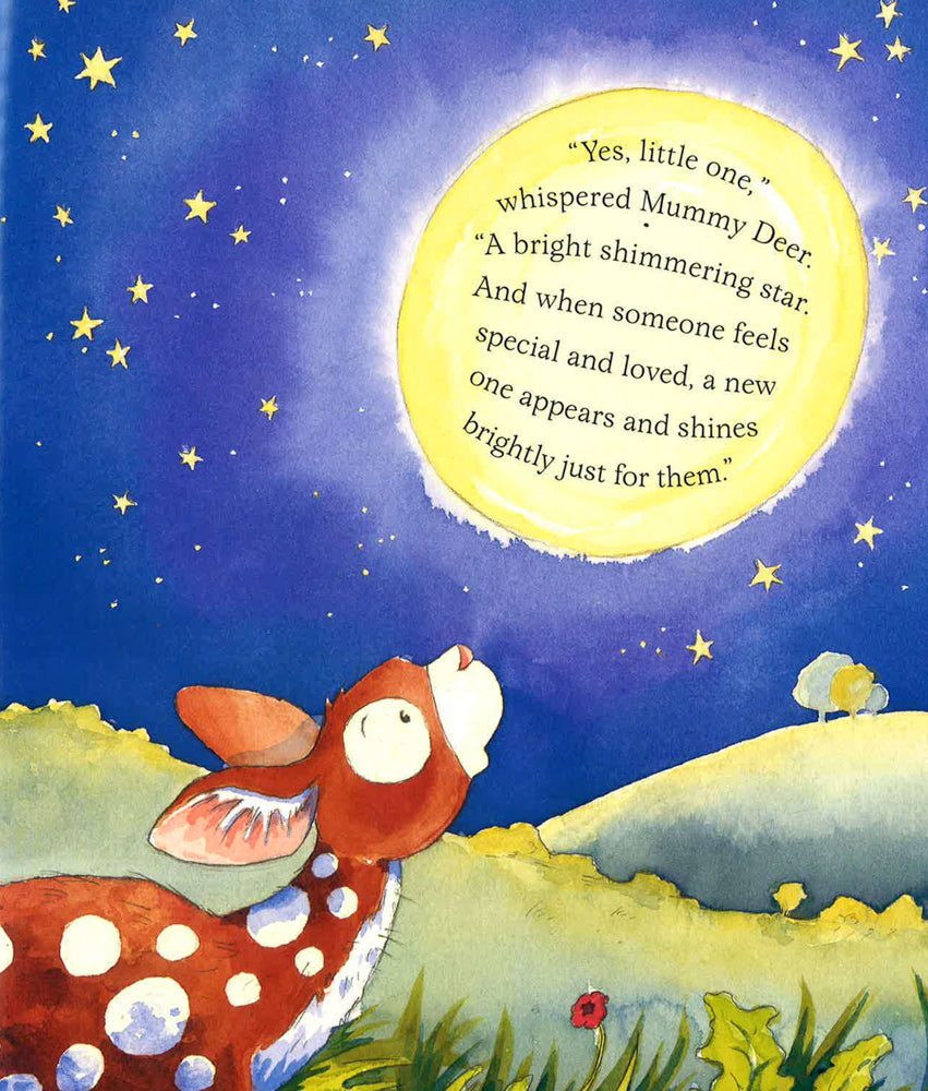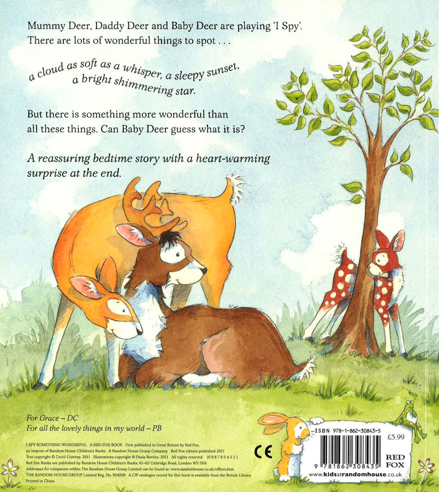 Mummy Deer, Daddy Deer and Baby Deer are playing 'I spy'. There are lots of wonderful things to spot . . . a cloud as soft as a whisper, a sleepy sunset, a bright shimmering star. But there is something more wonderful than all these things. Can Baby Deer guess what it is?The perfect bedtime book for all little ones who are loved by their mummy and daddy. The charming heart-shaped die-cut and gatefold wonderfully reiterate the sweet sentiments of this book. With wonderfully cute illustrations by new artist Paula Bowles.