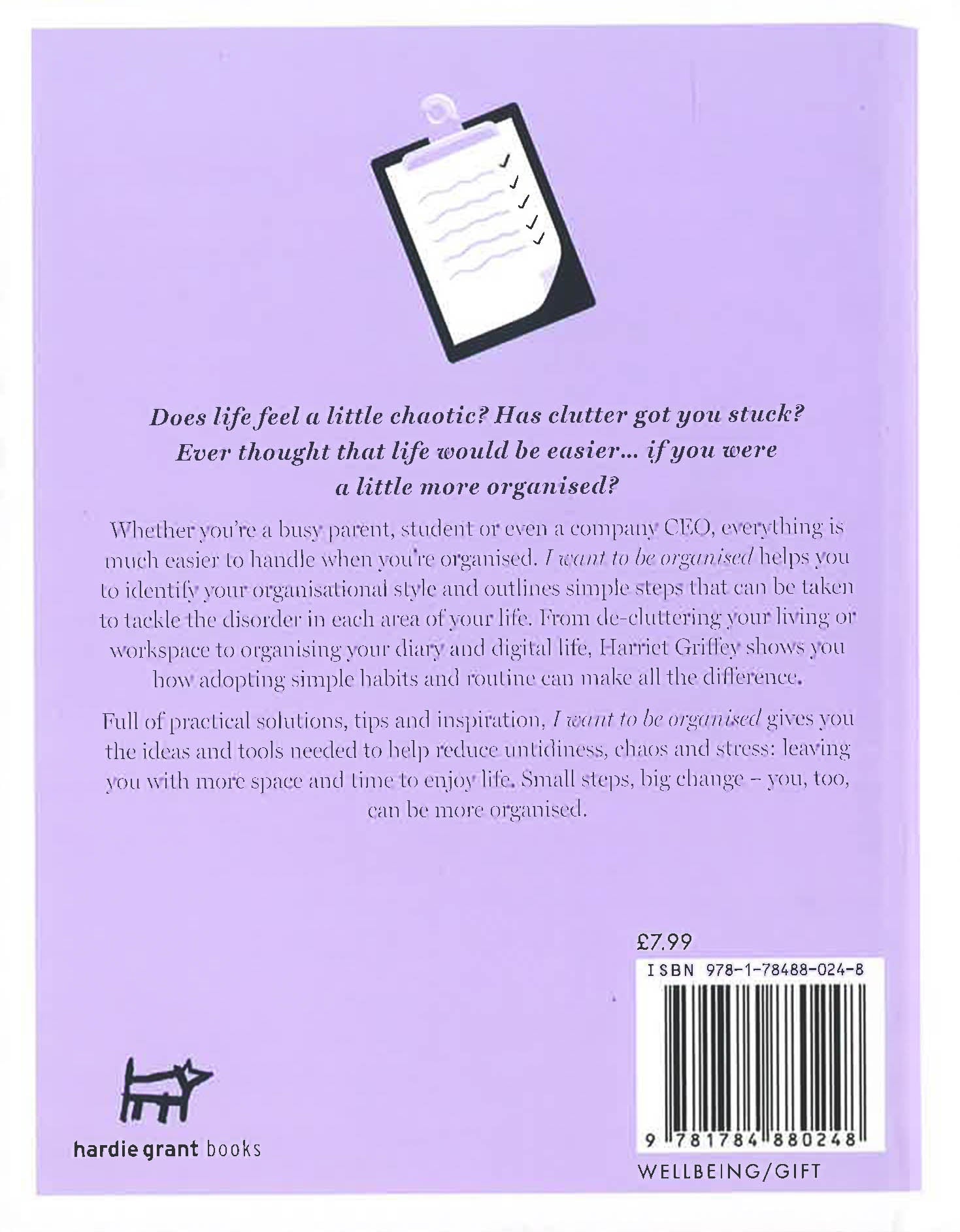 A charming and practical guide on how to live a more organised life.How much time would you save if you didn't have to spend it looking for mislaid car keys or that school permission slip you should have signed? How much simpler and less stressful could life be, if only you were a little more organised?In I Want to Be Organised, Harriet Griffey shows how a few simple steps can help turn the most chaotic and dysfunctional amongst us into the serenely organised someone who never misses their grandmother's birthday, loses the dry-cleaning slip, or fails to plan a successful dinner party.This book is full of practical solutions, tips, and inspiration to help eliminate clutter, chaos, and stress and save both time and money in the process.