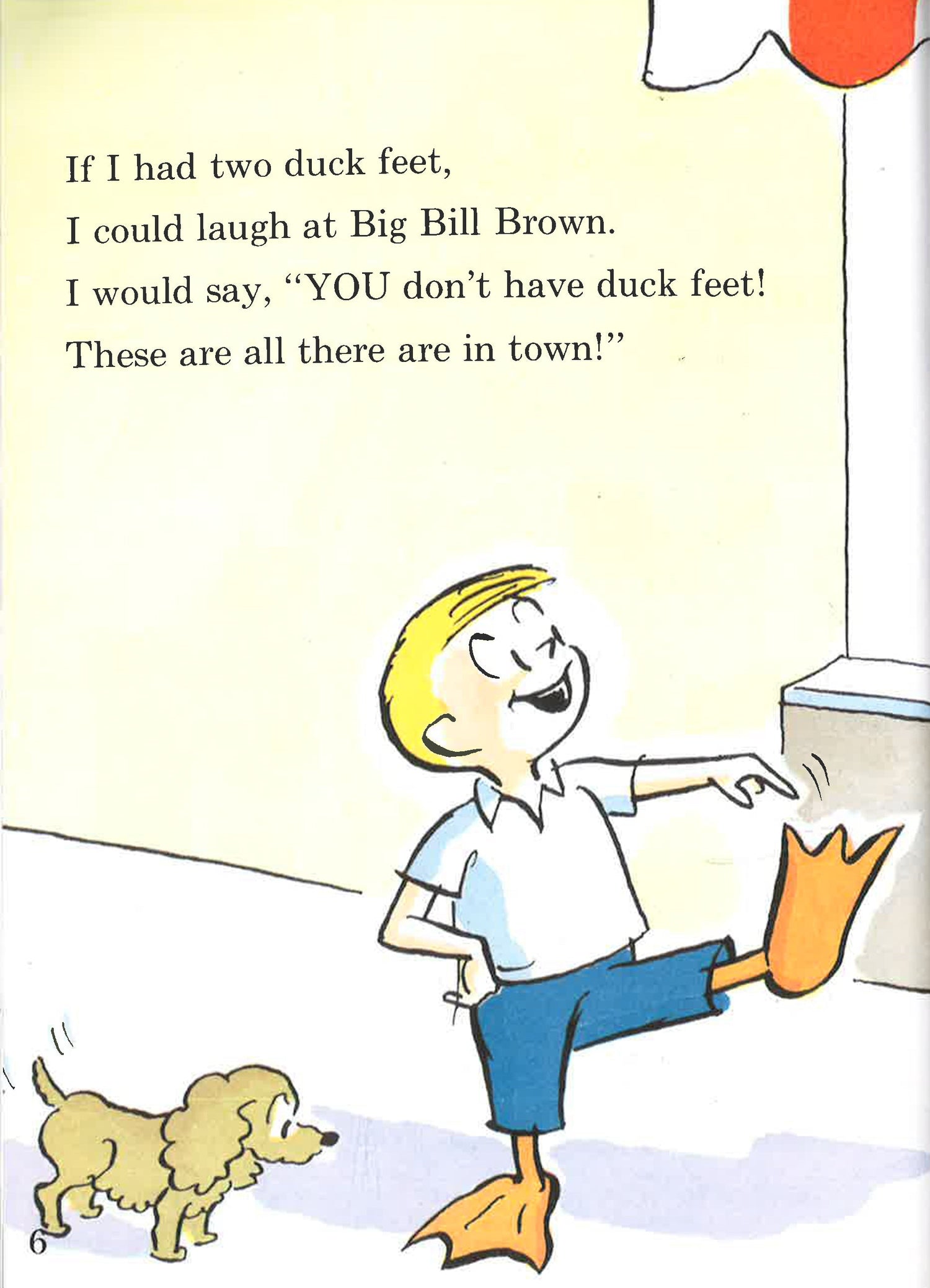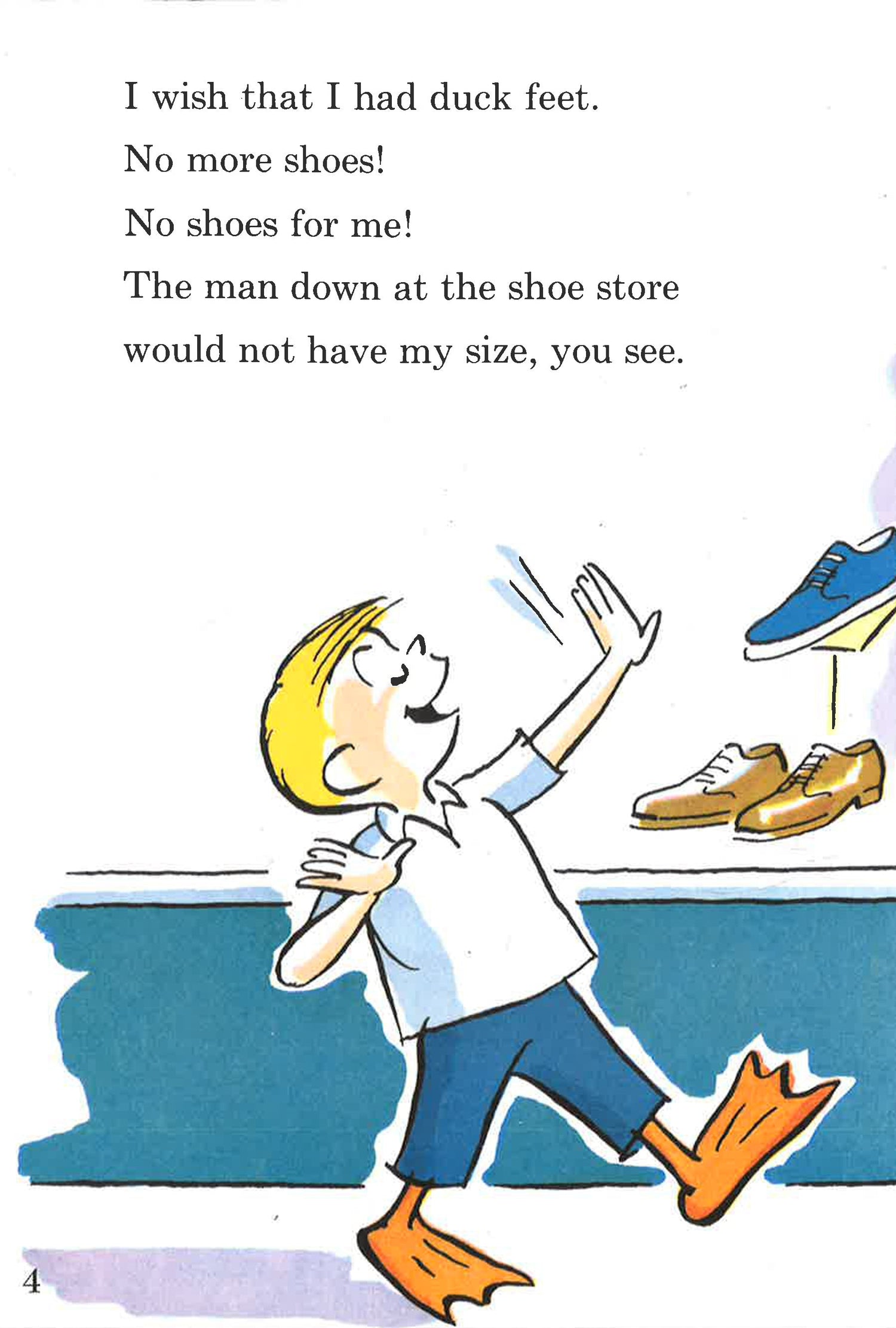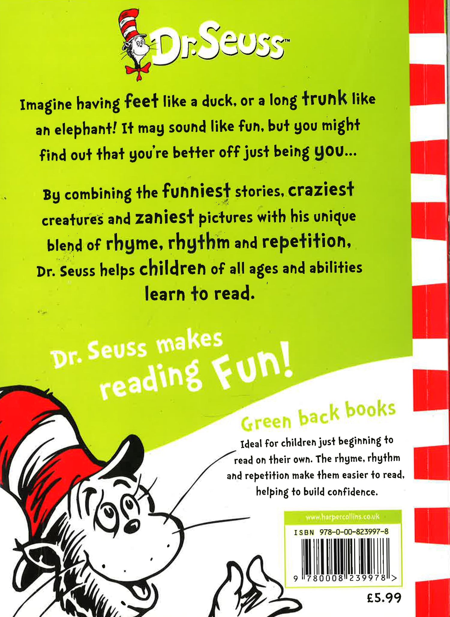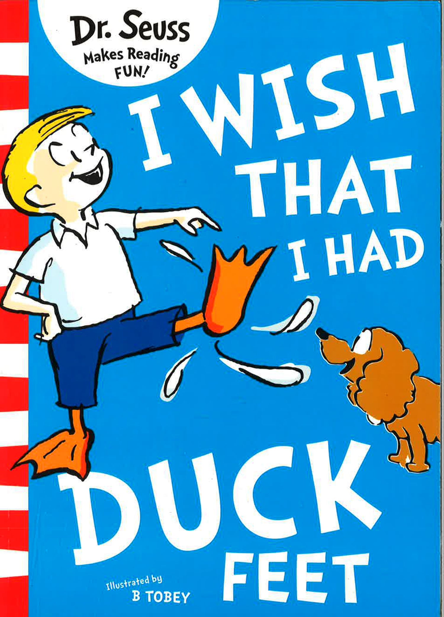 Being someone else might sound fun in this Dr. Seuss classic, but you might be better off just being YOU!Being someone else might sound fun in this Dr. Seuss classic, but you might be better off just being YOU! Can you imagine having feet like a duck, a spout like a whale, or a long trunk like an elephant? It may sound like fun, but you may find out that being just you is the best thing you can be... With his unique combination of hilarious stories, zany pictures and riotous rhymes, Dr. Seuss has been delighting young children and helping them learn to read for over fifty years. Creator of the wonderfully anarchic Cat in the Hat, and ranking among the UK's top ten favourite children's authors, Seuss is firmly established as a global best-seller, with over 600 million books sold worldwide. As part of a major rebrand programme, HarperCollins is relaunching Dr. Seuss's bestselling books, including such perennial favourites as The Cat in the Hat, Green Eggs and Ham and Fox in Socks. In response to consumer demand, the bright new cover designs incorporate much needed guidance on reading levels, with the standard paperbacks divided into three reading strands - Blue Back Books for parents to share with young children, Green Back Books for budding readers to tackle on their own, and Yellow Back Books for older, more fluent readers to enjoy. 'I Wish That I Had Duck Feet' belongs to the Green Back Book range, and is illustrated by B. Tobey.