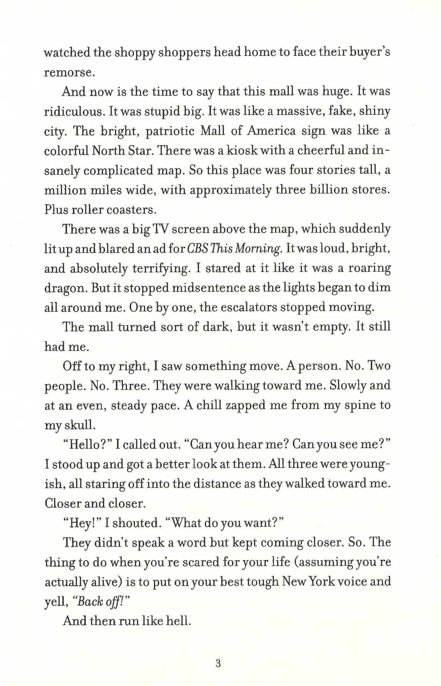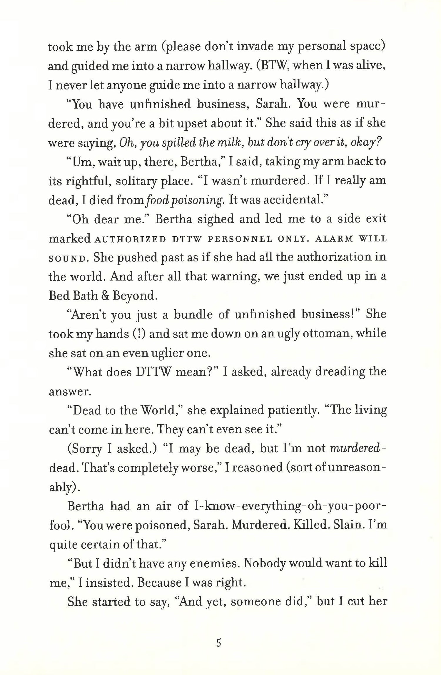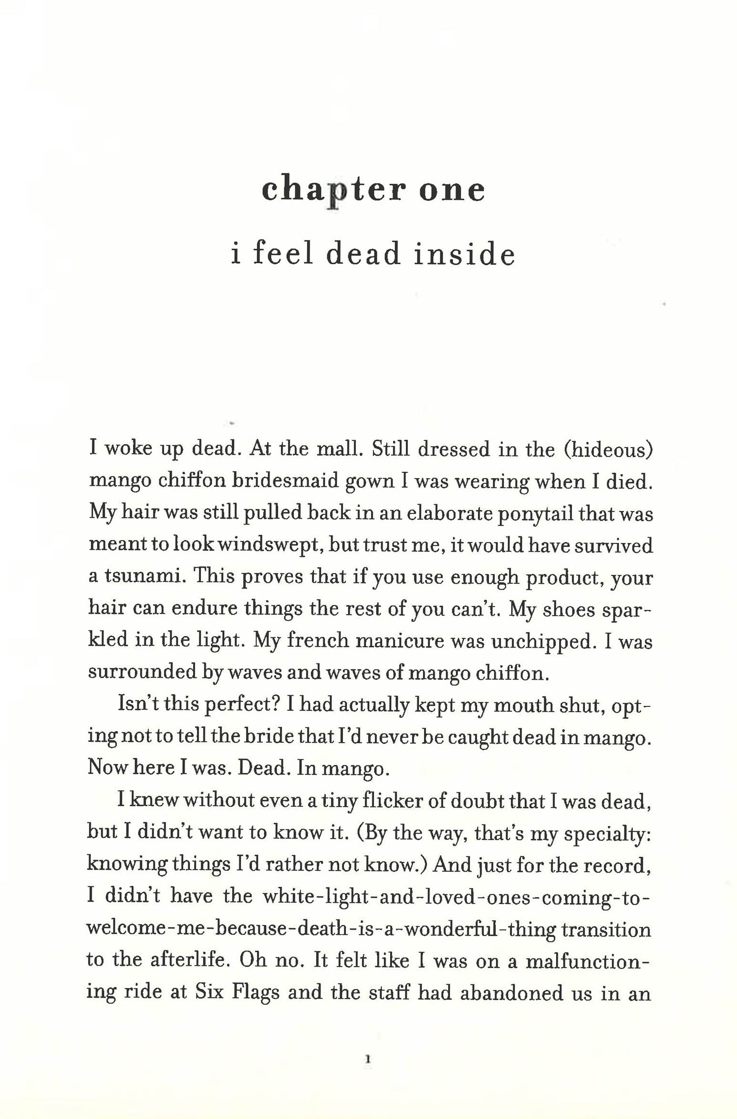 When you're sixteen, you have your whole life ahead of you. Unless you're Sarah. Not to give anything away, but . . . she's dead. Murdered, in fact. Sarah's murder is shocking because she couldn't be any more average. No enemies. No risky behavior. She's just the girl on the sidelines. It looks like her afterlife, on the other hand, will be pretty exciting. Sarah has woken up dead at the Mall of America--where the universe sends teens who are murdered--and with the help of her death coach, she must learn to move on or she could meet a fate totally worse than death: becoming a mall walker. As she tries to finish her unfinished business alongside her fellow dead teens, Sarah falls hard for a cute boy named Nick. And she discovers an uncanny ability to haunt the living. While she has no idea who killed her, or why, someone she loves is in grave danger. Sarah can't lose focus or she'll be doomed to relive her final moments again and again forever. But can she live with herself if she doesn't make her death matter?