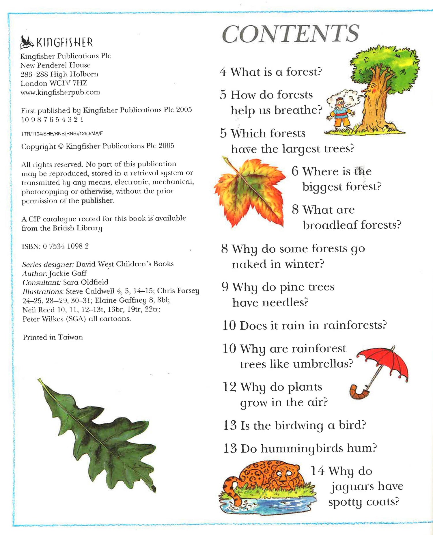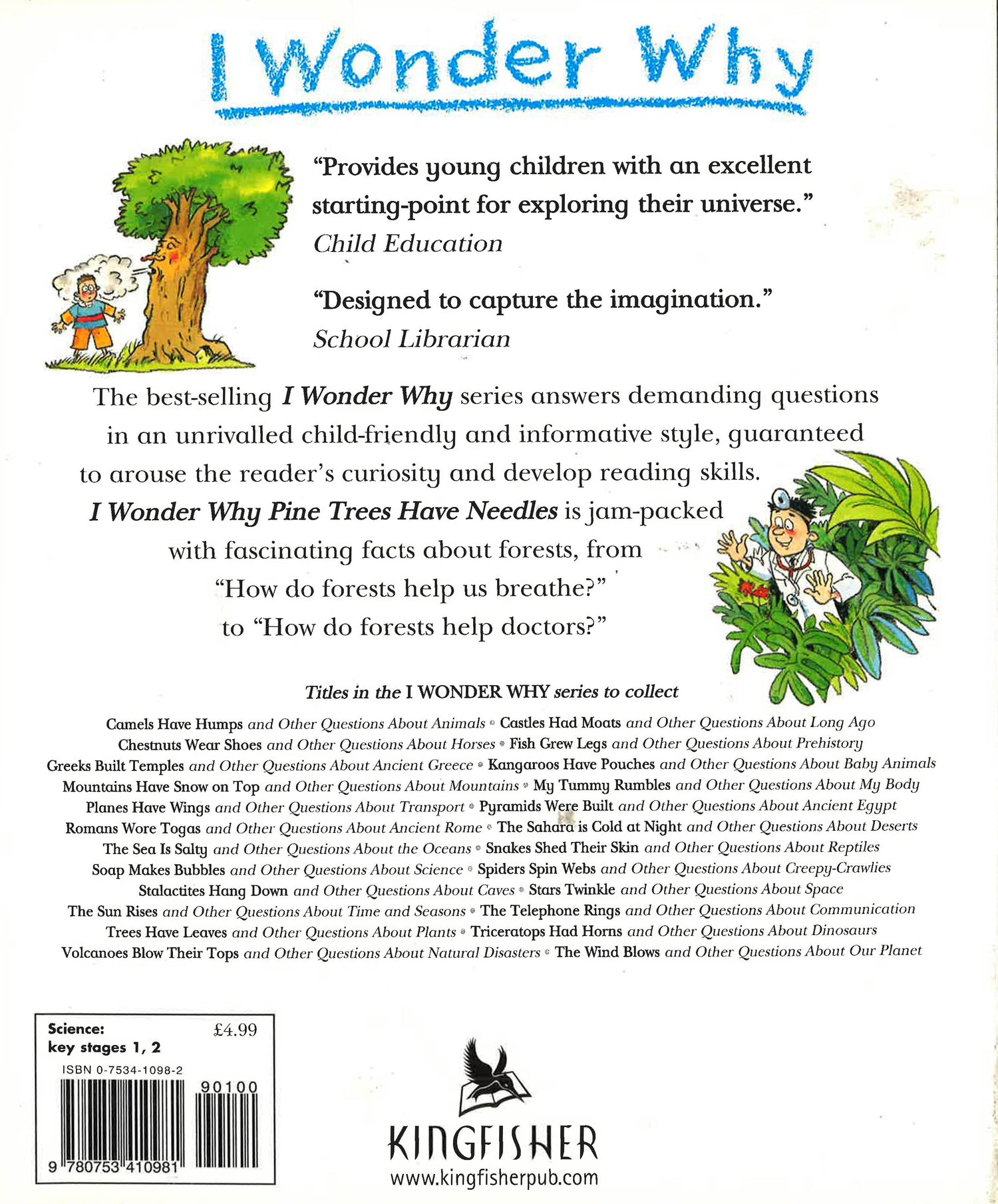 The best-selling I Wonder Why series has always been the perfect place for children to find the answers to their questions. With their quirky style and informative text, these books are great for gripping the imagination and for developing reading skills. Designed to amuse and intrigue the young reader, I Wonder Why Pine Trees Have Needles and Other Questions About Forests answers all sorts of fascinating questions that children ask about forests and woodlands, from tropical rainforests and unusual forests to forest animals such as hummingbirds, spider monkeys, woodpeckers and koalas. It also explains why forests help us to breathe, and looks at what can be done to save forests from danger. Illustrated with stunning, high-quality artwork, a wealth of information is backed up with fun facts and lively cartoons.