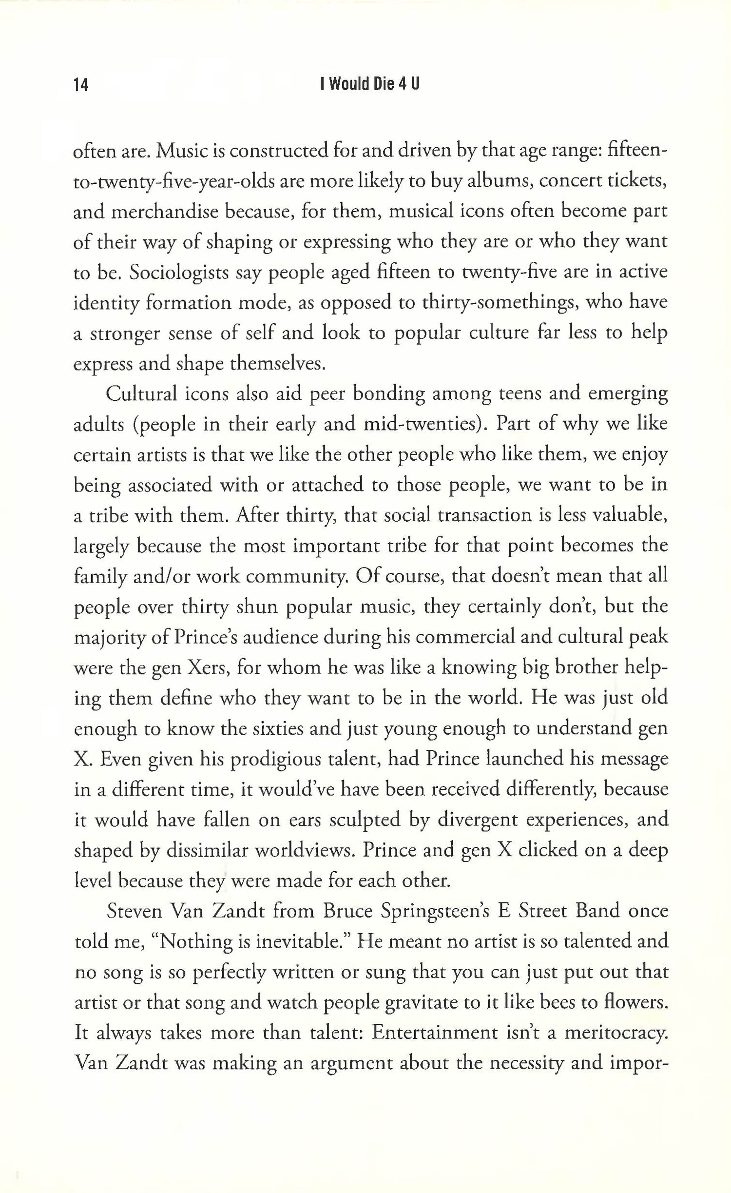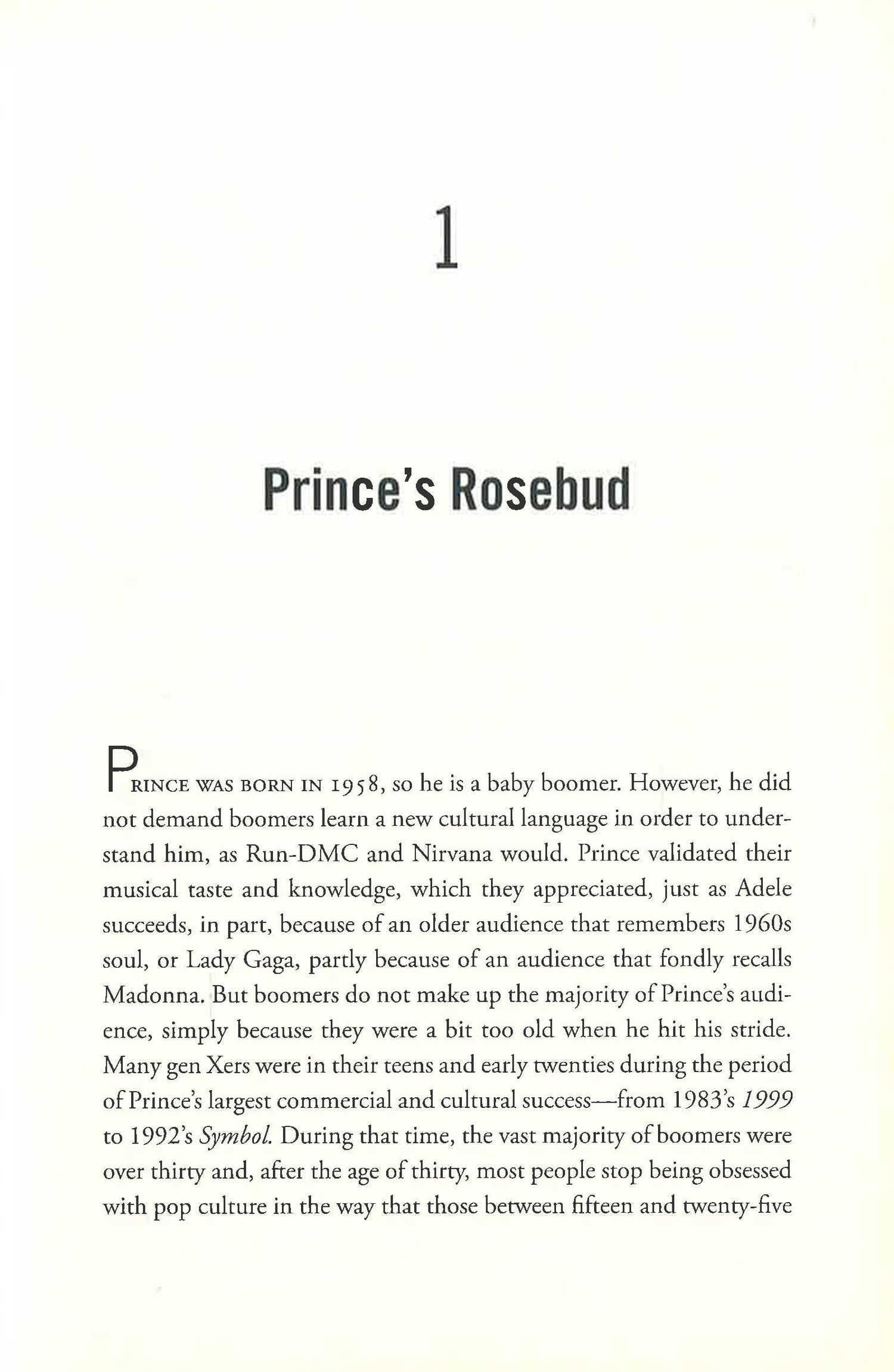 Prince’s baby boomer status allowed him to play a wise older brother to the latchkey kids of generation X. Defying traditional categories of race, gender, and sexuality, he nonetheless presents a very traditional conception of religion and God in his music. He was an MTV megastar and a religious evangelist, using images of sex and profanity to invite us into a musical conversation about the healing power of God. By demystifying the man and his music, I Would Die 4 U shows us how Prince defined a generation.
