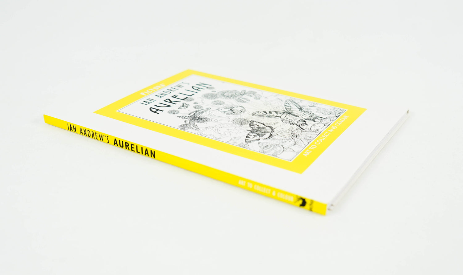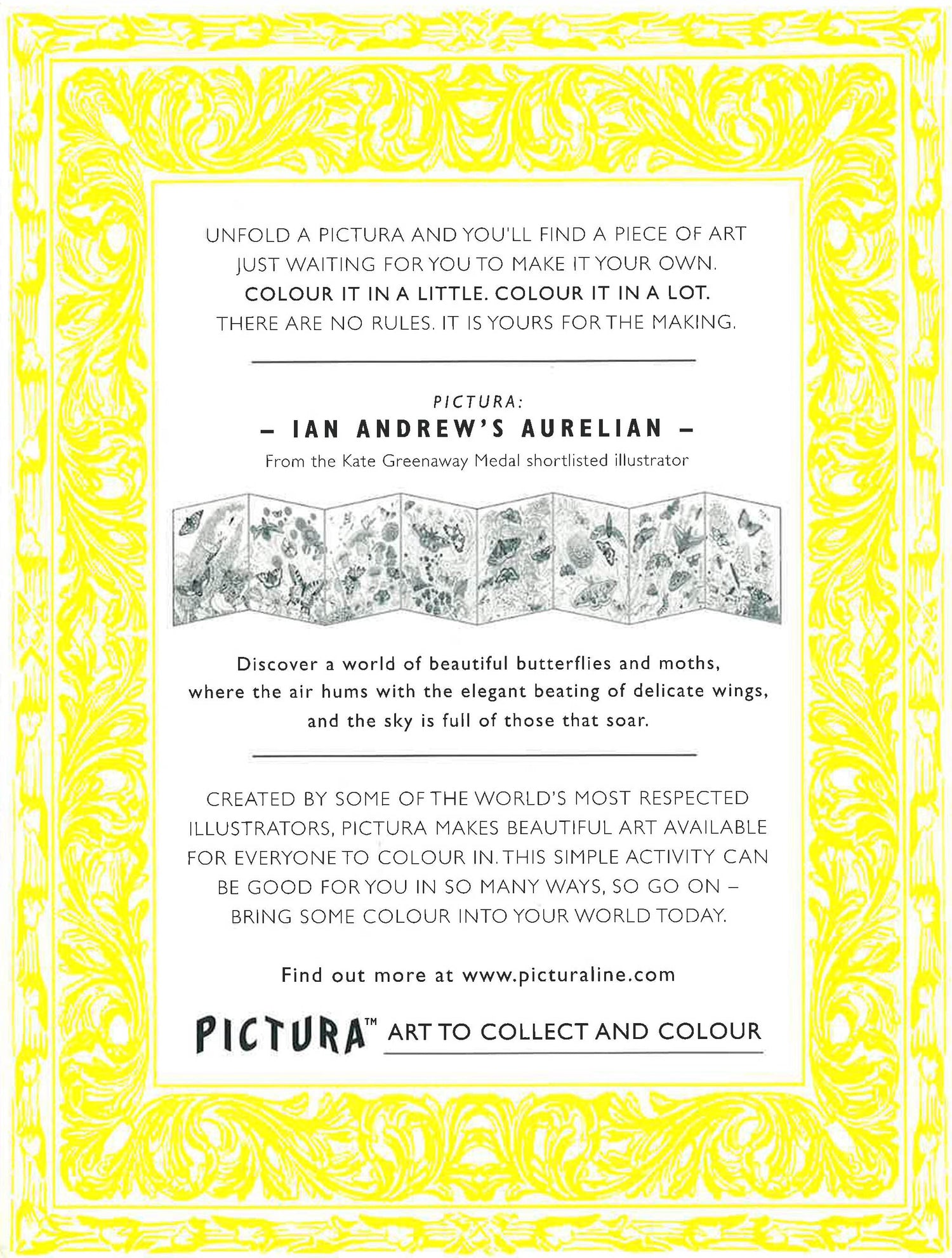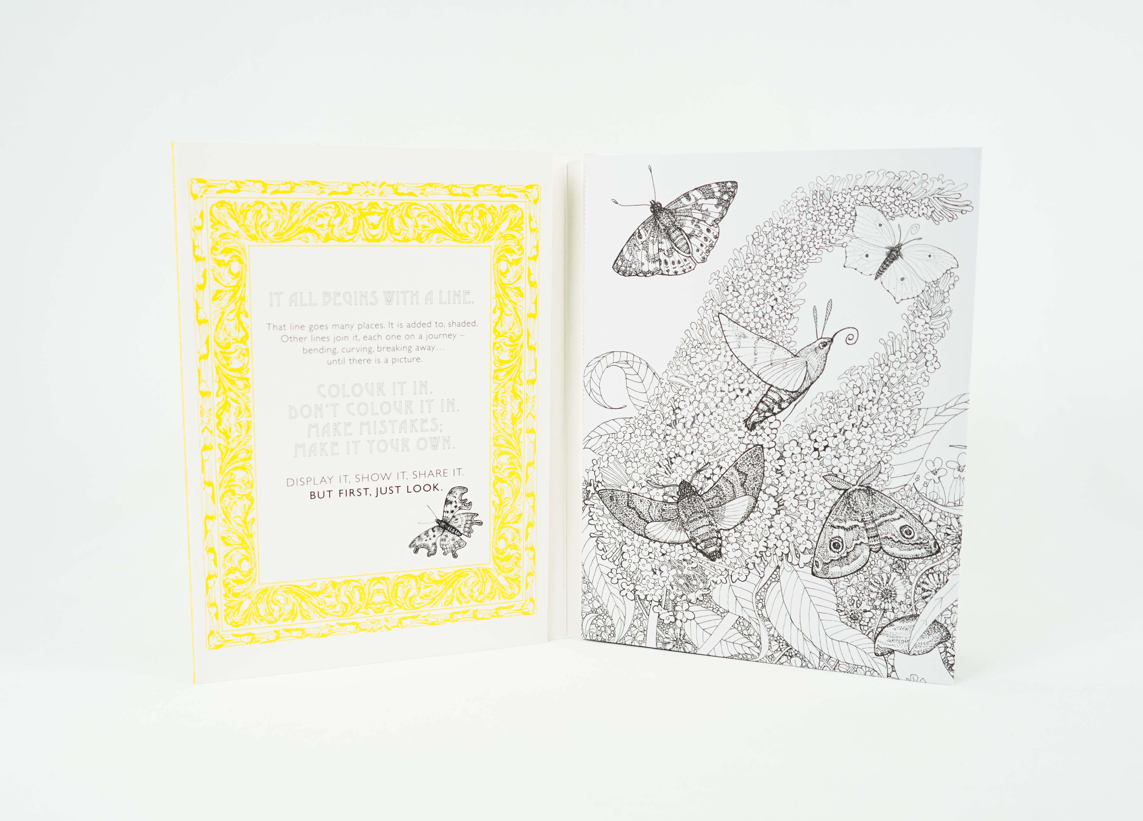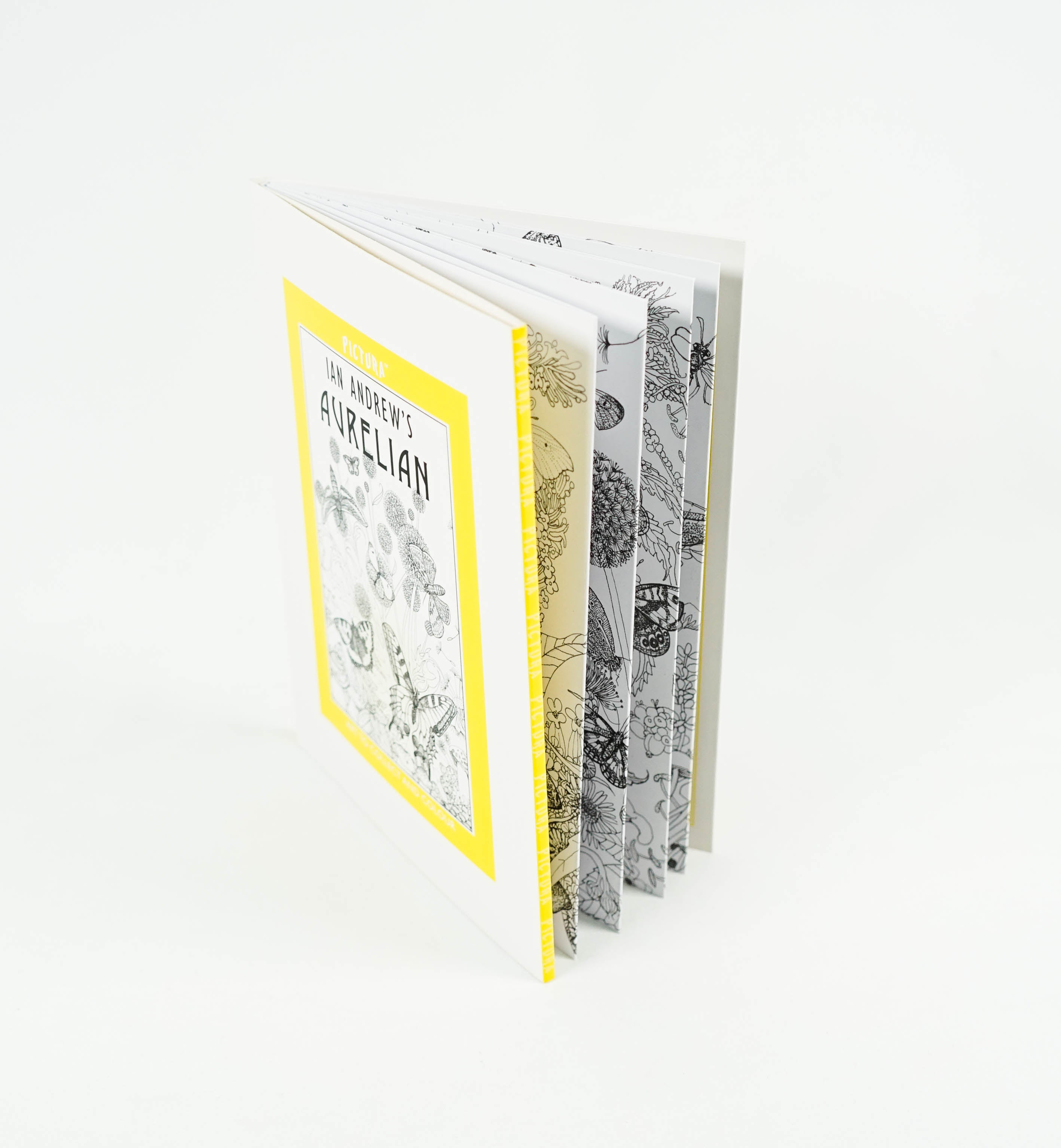 In Aurelian, the concertina is filled with a gorgeous array of butterflies and moths, desperate for you to add their colour. The back features a key to their species and a further illustration metamorphosis showing the journey a butterfly will take: from caterpillar, to cocoon, to rebirth.