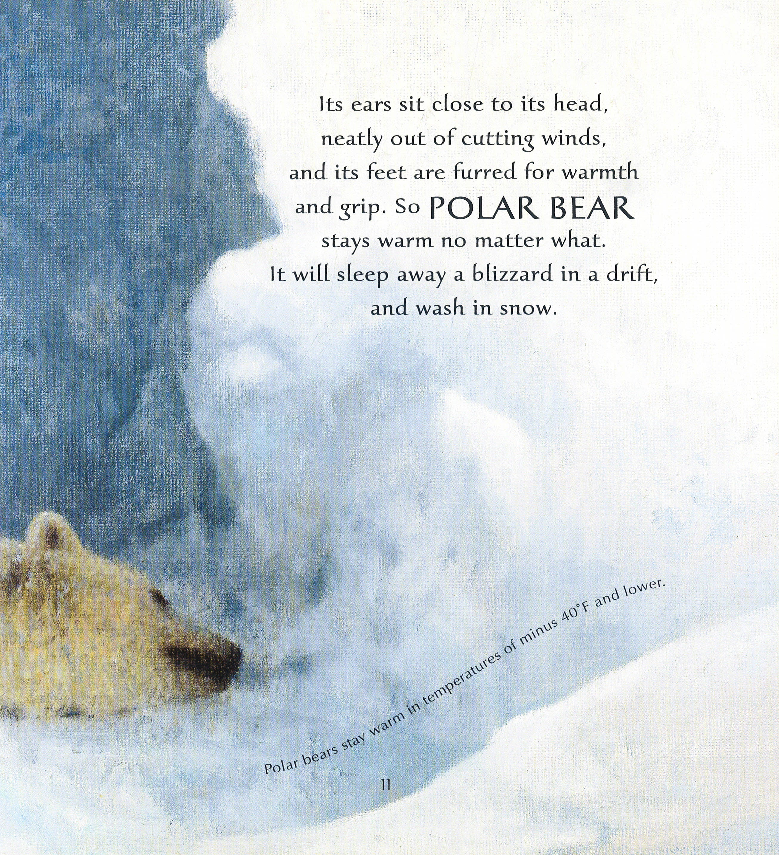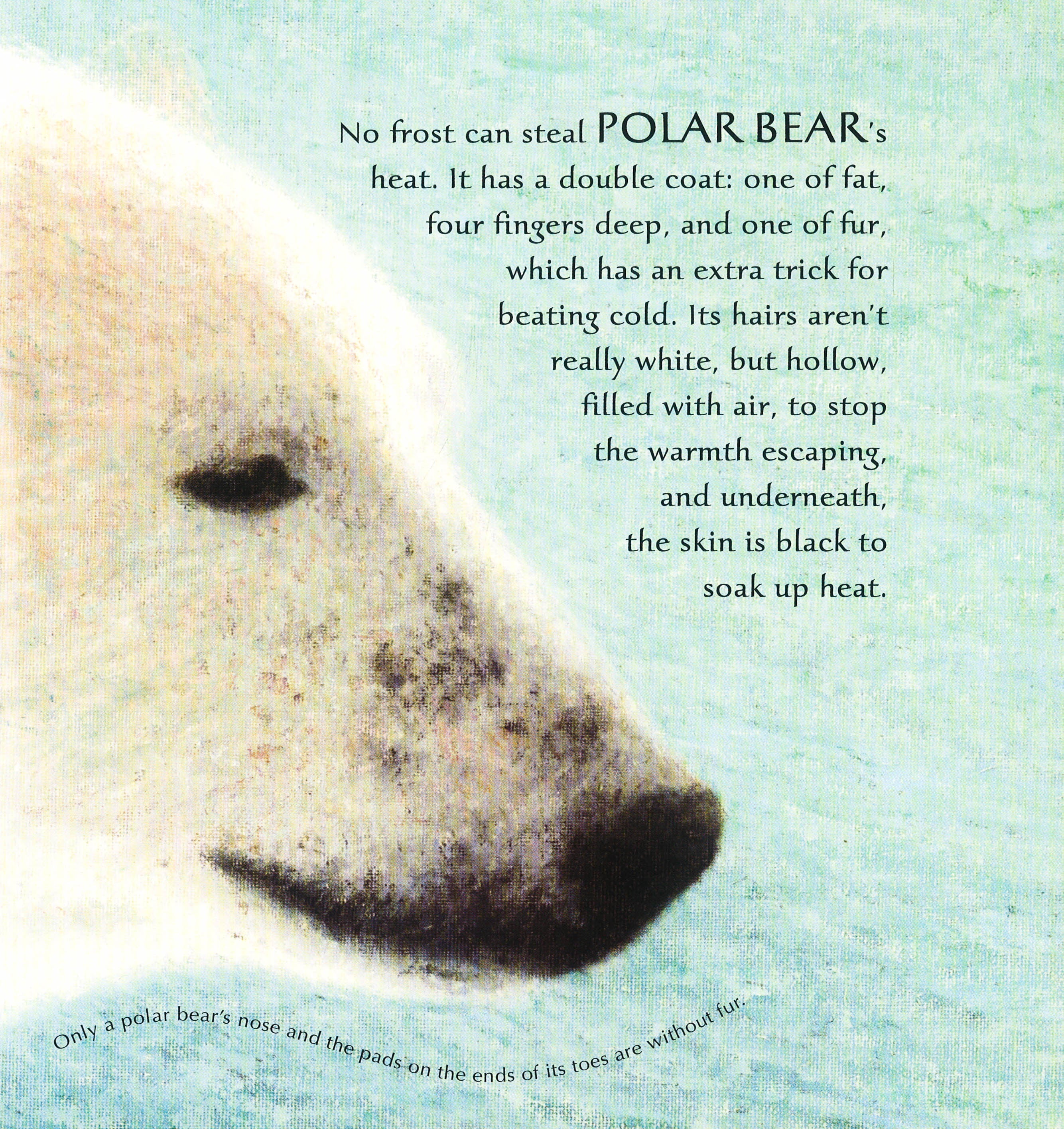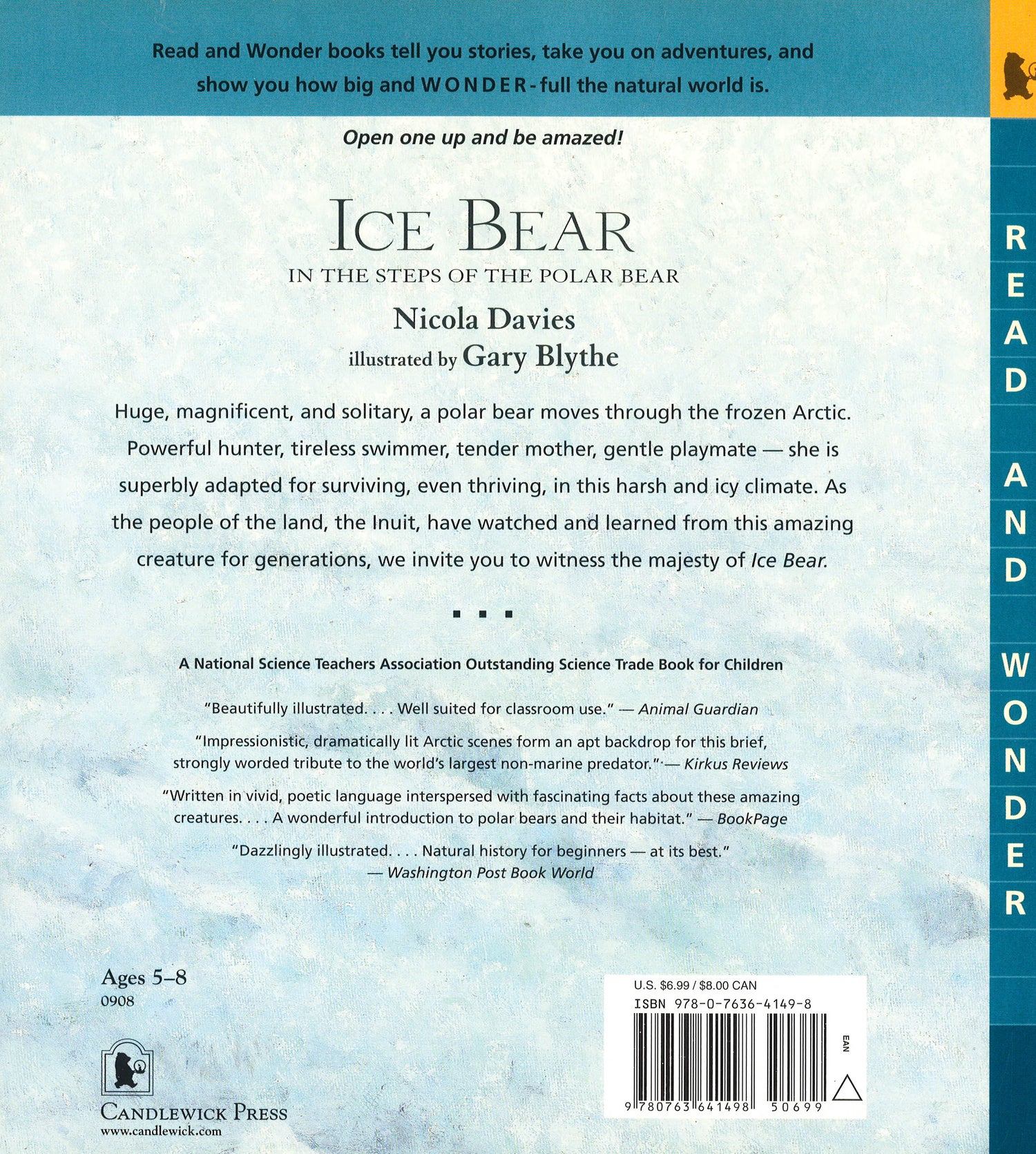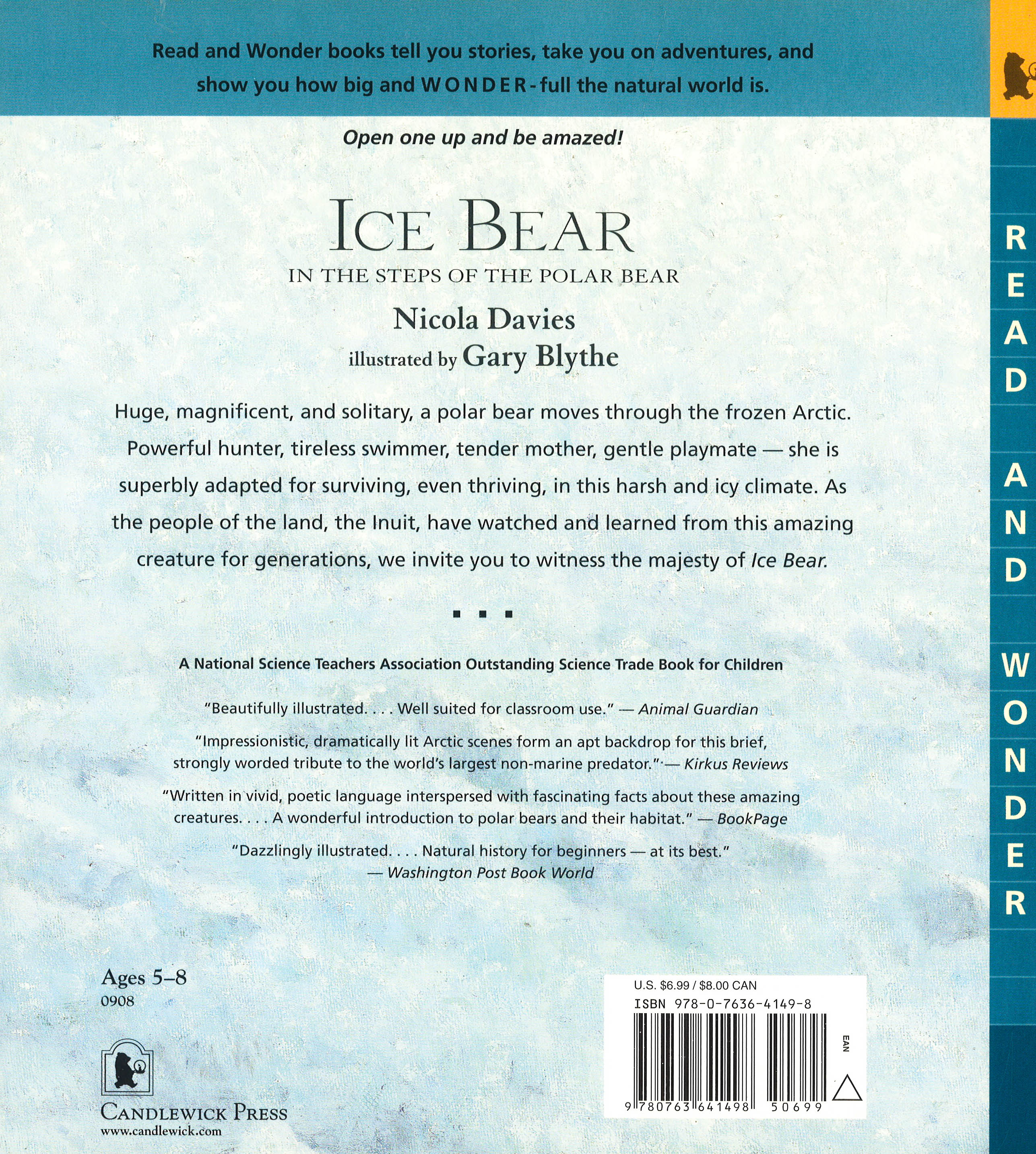Huge, magnificent, and solitary, a polar bear moves through the frozen Arctic. Powerful hunter, tireless swimmer, tender mother, gentle playmate she is superbly adapted for surviving, even thriving, in this harsh and icy climate. Written in poetic language interspersed with fascinating facts, Nicola Davies' breathtaking tale of this massive, stark white animal is brought to life in striking paintings by Gary Blythe. Just as the Inuit people have watched and learned from this amazing creature for generations, readers are invited to witness the majesty of Ice Bear."