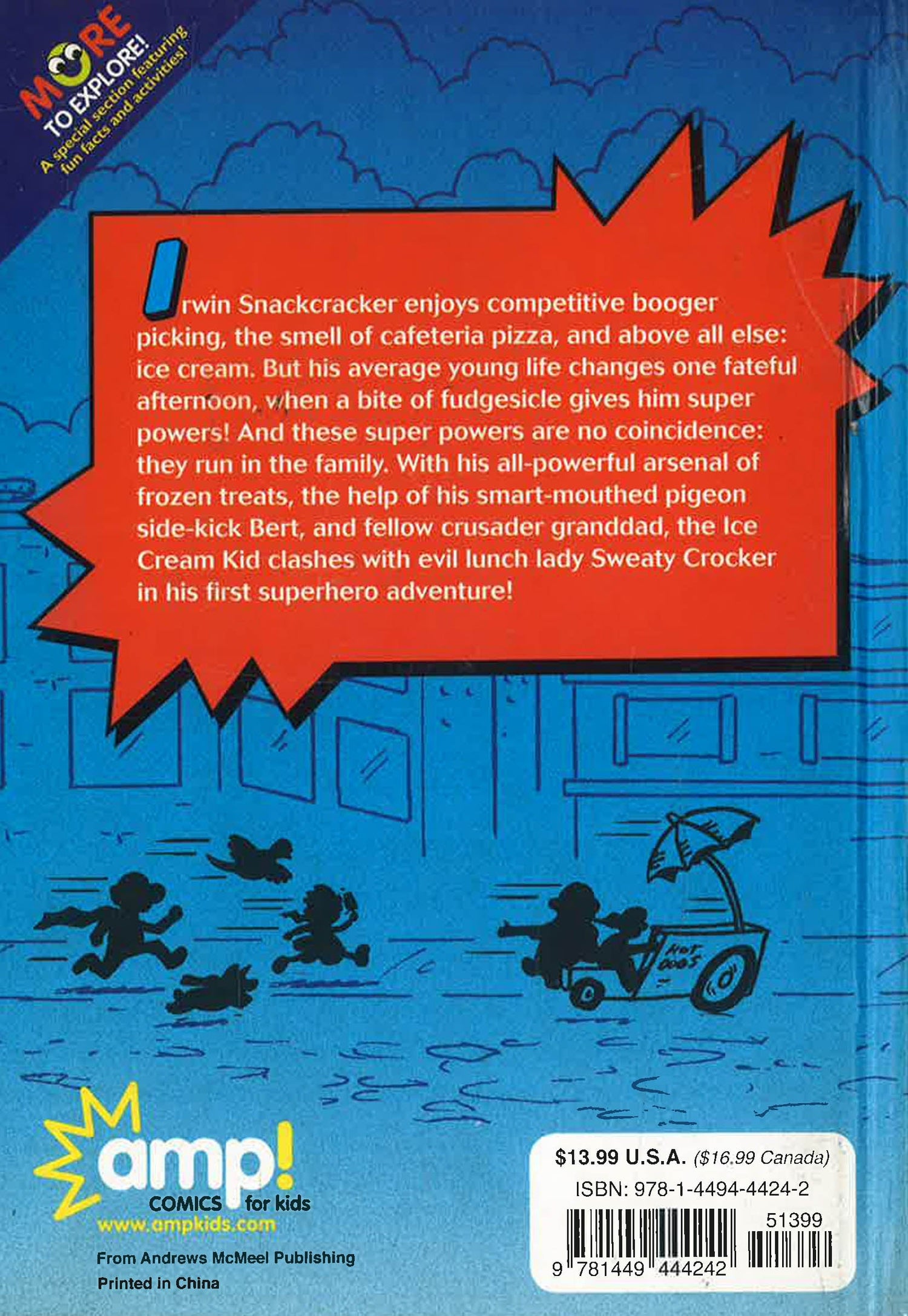 Introducing Irwin Snackcracker, seemingly ordinary fourth grader who is transformed through the power of a Fudgsicle into superhero extraordinaire. The Ice Cream Kid! When Irwin Snackcracker leaves for school in the morning all he can think about is pizza, tater tots, and winning first place in the booger contest. He leaps down the bannister, quickly eats breakfast before brushing his teeth and dashing out the door. Little does Irwin know, this day will change his life. He is just one brain freeze away from superpowers! When Irwin unexpectedly scores the last Fudgsicle left in the ice cream cart at school, he finds out that he is no longer an ordinary fourth grader. Taking a big bite of the delicious frozen treat transforms Irwin into "The Ice Cream Kid" who, with a steady supply of ice cream, has the ability to run at lightning speed and talk to animals along the way! Even though Irwin isn't sure if he wants to fight crime, he puts riding bikes with his friends on hold to learn how his new powers work. With his superhero Grandpa and sarcastic side-kick, Bert the pigeon, Irwin learns to control his powers, culminating in the ultimate showdown with Sweaty Crocker, the villainous evil lunch lady, poisoner of children.