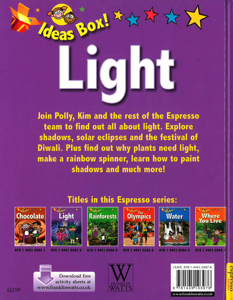 An exciting series of books with a wealth of information and ideas for exploring topics in a cross-curricular wayJoin Polly, Kim and the rest of the Espresso team to find out all about light. Explore shadows, solar eclipses and the festival of Diwali. Plus find out why plants need light, make a rainbow spinner, learn how to paint shadows and much more! This book is part of the Espresso Ideas Box series, which have a wealth of information and ideas for exploring topics in a cross-curricular way. They are produced in association with Espresso Education, the leading digital curriculum service in the UK - used in over 10,000 primary schools.
