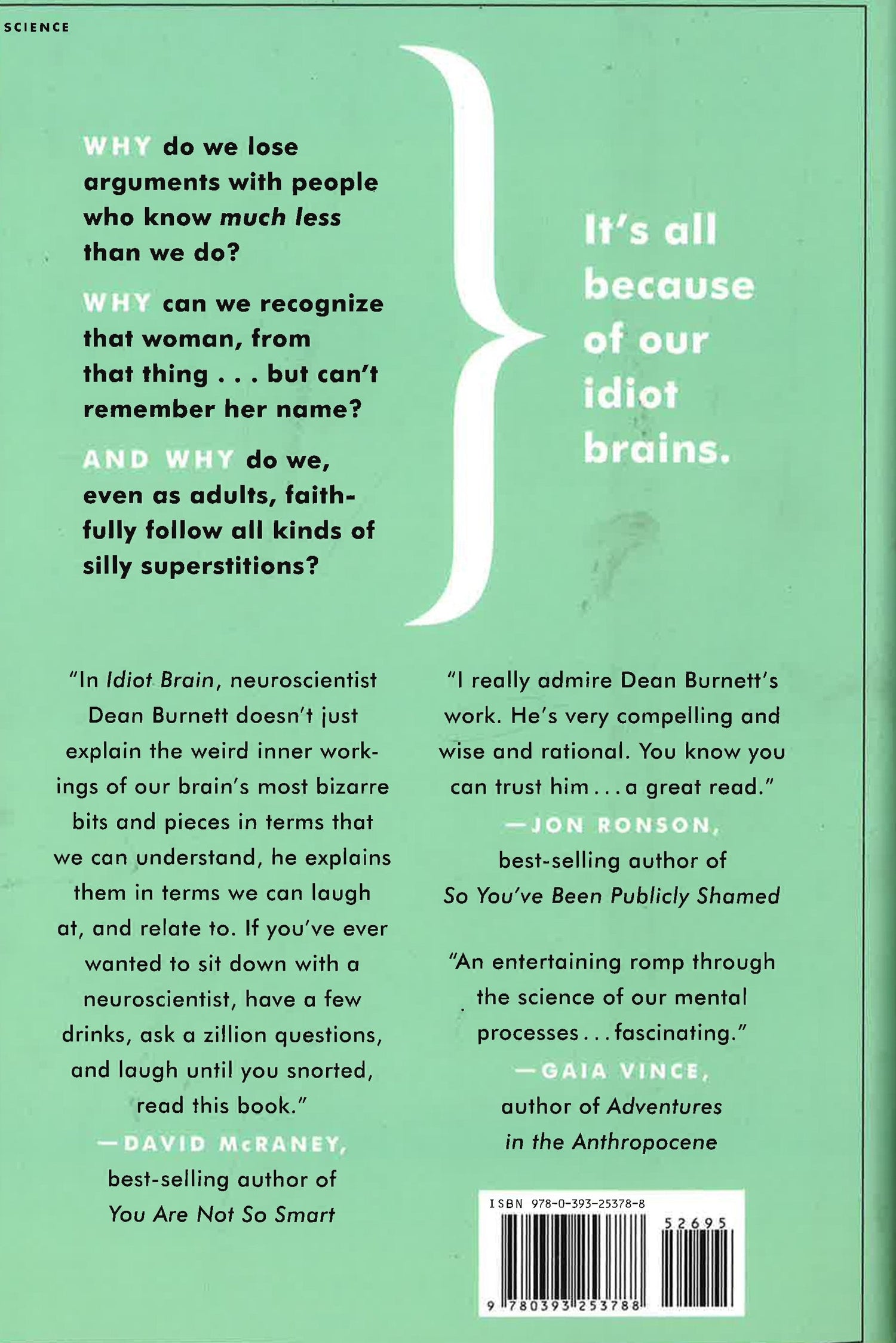 Yet all of this, believe it or not, is the sign of a well-meaning brain doing its best to keep you alive and healthy. In Idiot Brain, neuroscientist Dean Burnett celebrates blind spots, blackouts, insomnia, and all the other downright laughable things our minds do to us, while also exposing the many mistakes we've made in our quest to understand how our brains actually work. Expertly researched and entertainingly written, this book is for everyone who has wondered why their brain appears to be sabotaging their life, and what on earth it is really up to.