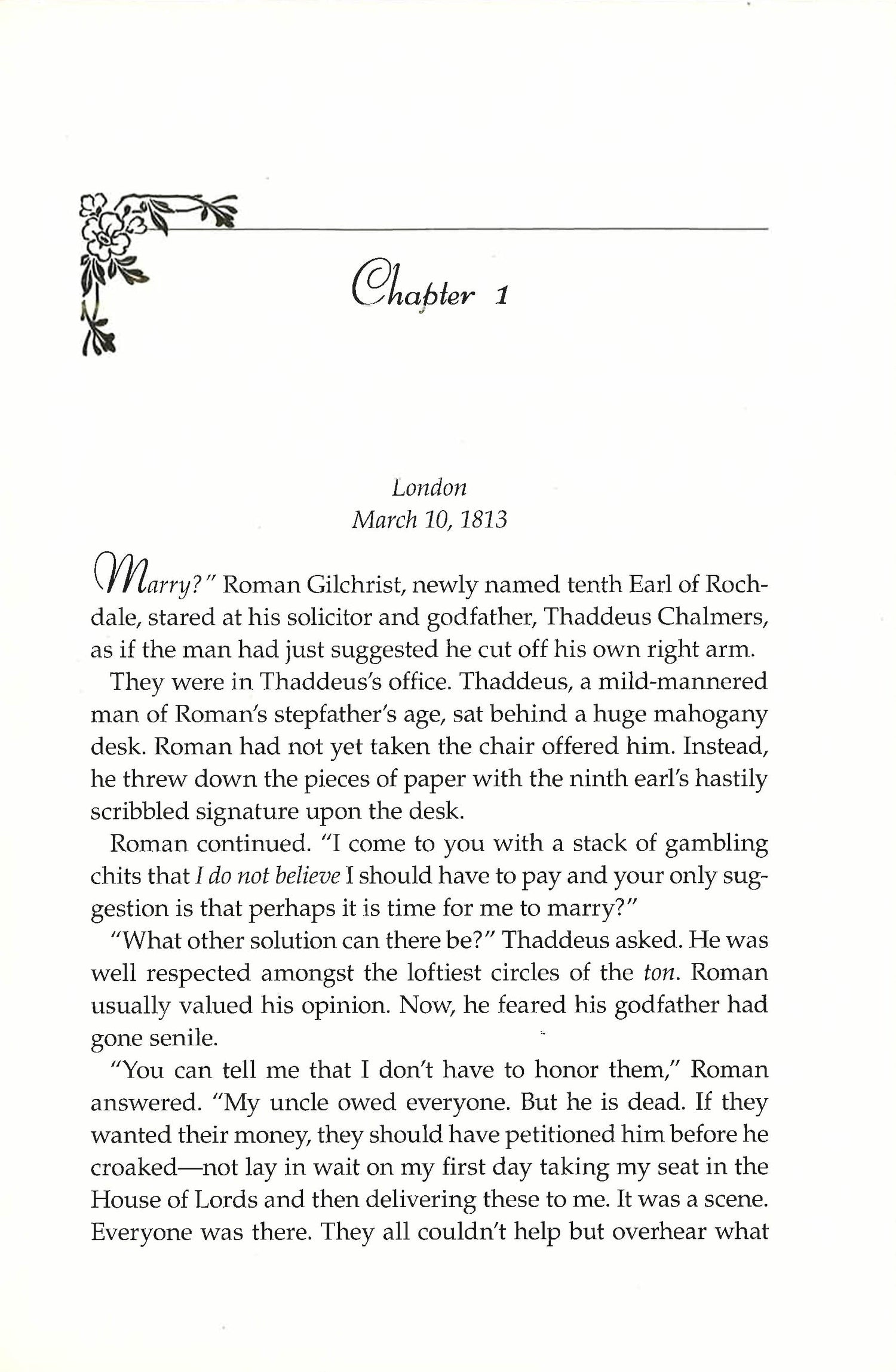 His choice: Leonie Charnock, one of the season's "Spinster Heiresses." Years before, the earl had saved the dark-eyed beauty's reputation, and she is still breathtakingly lovely, leading Rochdale to hope that their marriage will be more than in name only.