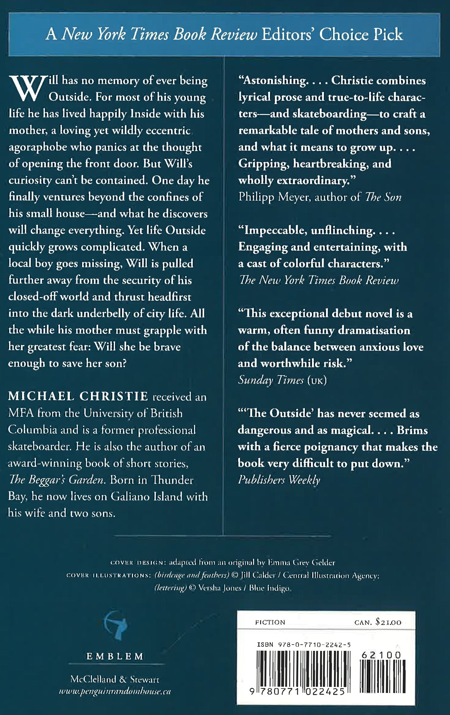 Will has never been Outside, at least not that he can remember. For most of his young life he has lived happily Inside with his mother, Diane, a fiercely loving yet wildly eccentric agoraphobe who drowns in panic at the thought of opening the front door. Then, one day, Will ventures Outside clad in a protective helmet and braces himself for danger. What he finds instead will set him on an unexpected journey of discovery. Will embraces the Outside and his newfound freedom with enthusiasm, and he eventually befriends Jonah, a quiet Native boy who introduces him to the most reckless and exhilarating activity he's ever seen: skateboarding. Even as Diane's fears intensify, Will finds his own fears fading and his body hardening with each new bruise, scrape, and fall. But life Outside quickly grows complicated, and Diane finds herself grappling with her greatest fear: will she be brave enough to save her son?