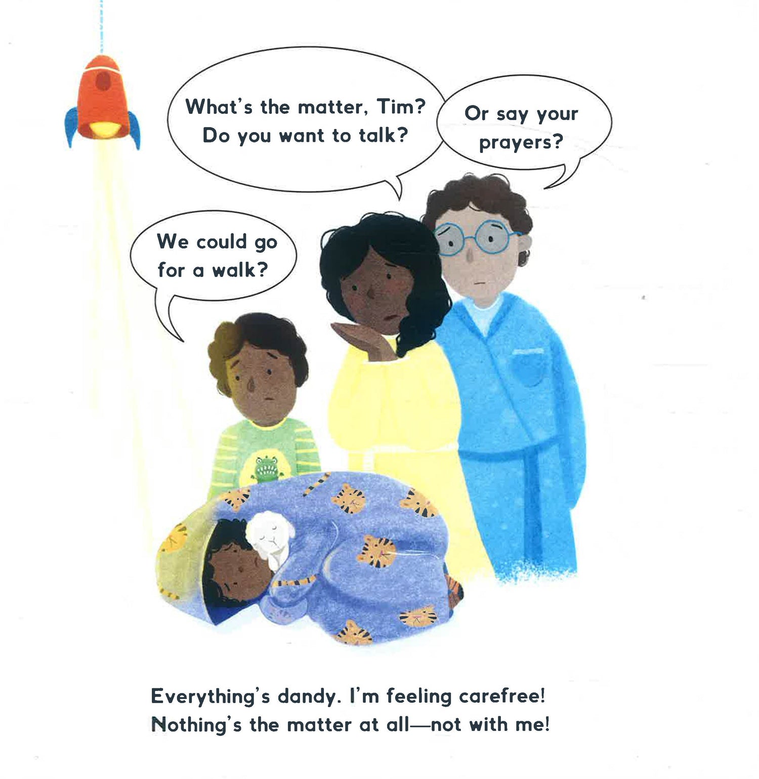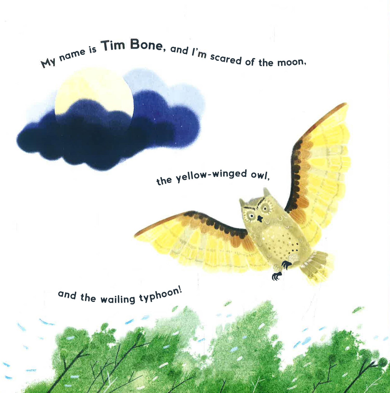 Meet Tim Bone. He has a big imagination, and when it roams wild, he’s afraid of a lot of things. He's scared of the moon and the wailing typhoon, and he won't wear his sneakers because he fears hidden creatures. Tim's nervous at home, at school, and at play!