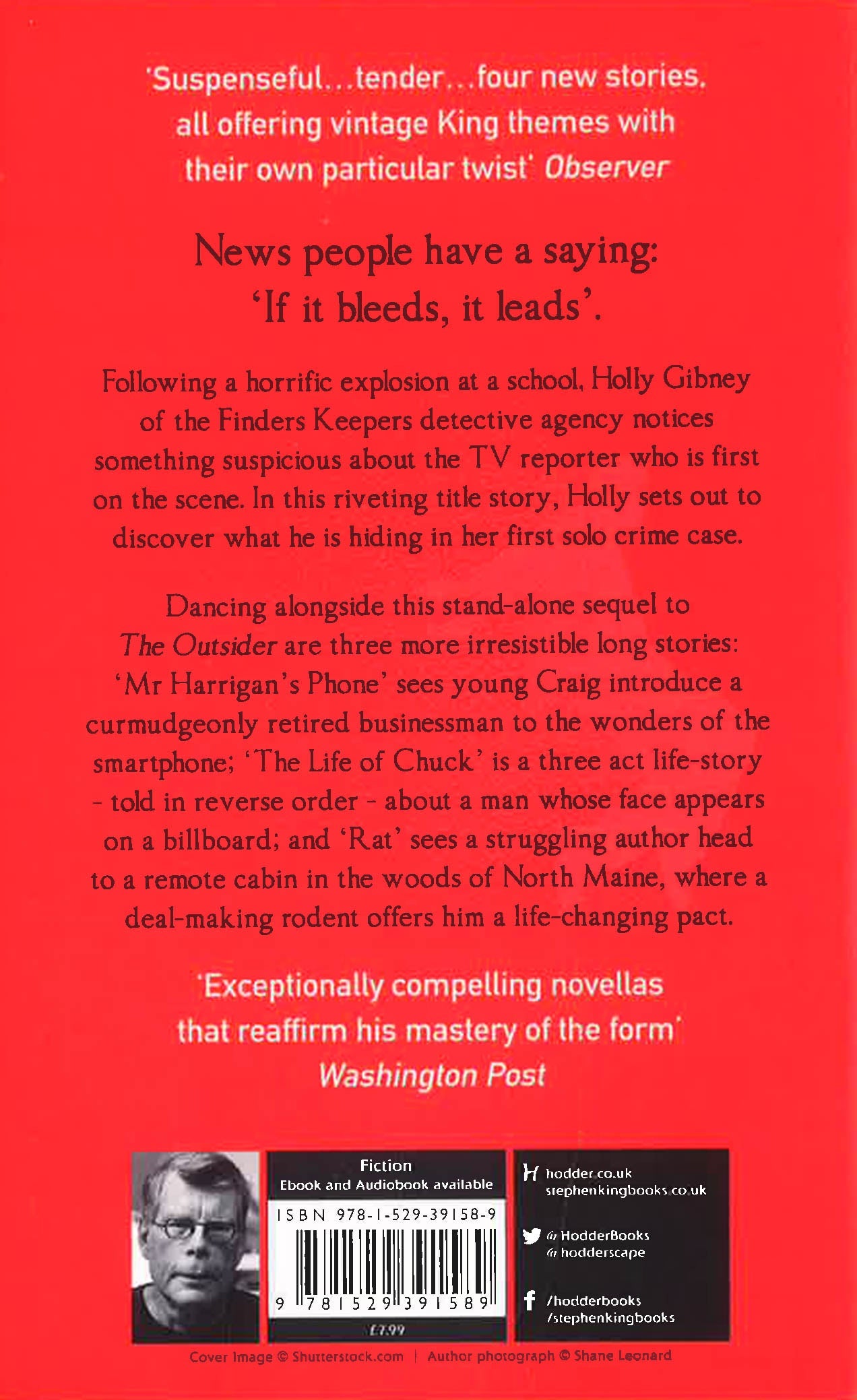 Holly Gibney of the Finders Keepers detective agency is working on the case of a missing dog - and on her own need to be more assertive - when she sees the footage on TV. But when she tunes in again, to the late-night report, she realises something is not quite right about the correspondent who was first on the scene. So begins 'If It Bleeds', a stand-alone sequel to the No. 1 bestselling THE OUTSIDER featuring the incomparable Holly on her first solo case - and also the riveting title story in Stephen King's brilliant new collection.